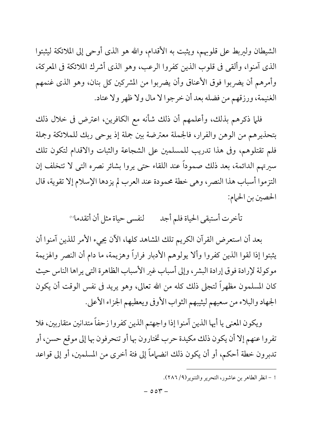 فلما ذكرهم بذلك، وأعلمهم أن ذلك شأنه مع الكافرين، اعترض في خلال ذلك بتحذيرهم من الوهن والفرار، فالجملة معترضة بين جملة إذ يوحى ربك للملائكة وجملة فلم تقتلوهم، وفي هذا تدريب للمسلمين على الشجاعة والثبات والاقدام لتكون تلك سيرتهم الدائمة، بعد ذلك صموداً عند اللقاء حتى يروا بشائر نصره التى لا تتخلف إن التزموا أسباب هذا النصر، وهي خطة محمودة عند العرب لم يزدها الإسلام إلا تقوية، قال الحصين بن الحمام: