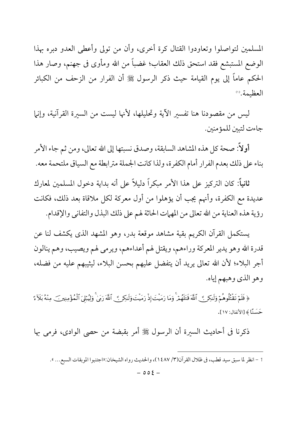 المسلمين لتواصلوا وتعاودوا القتال كرة أخرى، وأن من تولى وأعطى العدو دبره بهذا الوضع المستبشع فقد استحق ذلك العقاب؛ غضباً من الله ومأوى في جهنم، وصار هذا الحكم عاماً إلى يوم القيامة حيث ذكر الرسول - صَلَّى اللَّهُ عَلَيْهِ وَسَلَّمَ - أن الفرار من الزحف من الكبائر العظيمة. (¬1)