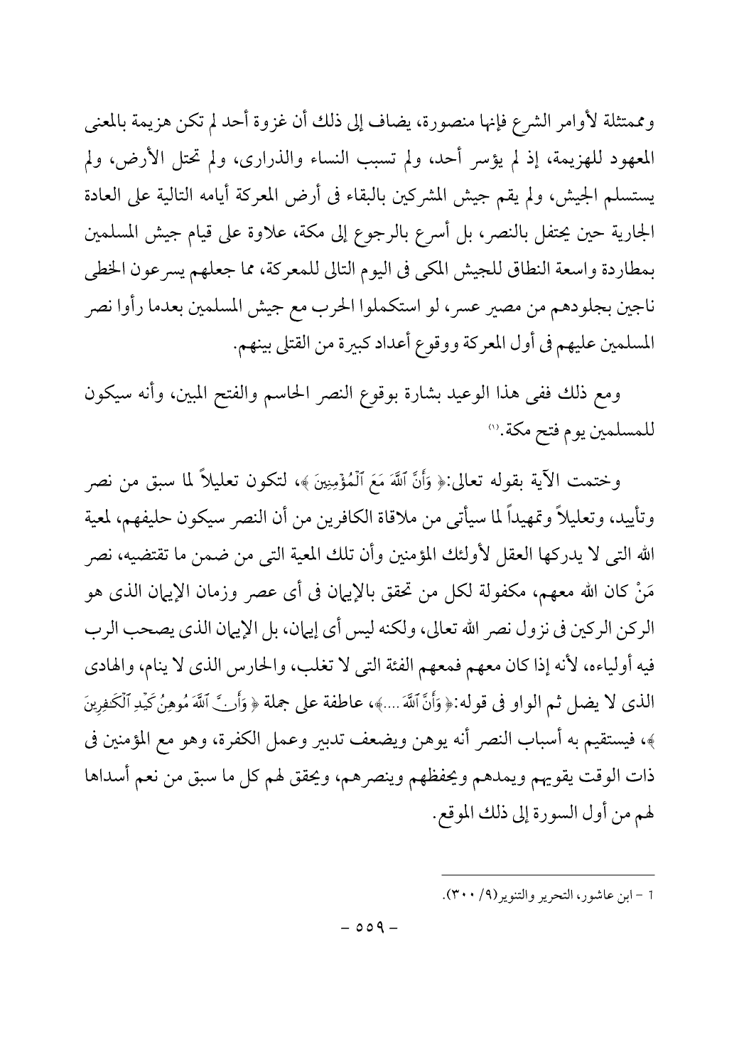 وختمت الآية بقوله تعالى: {وَأَنَّ اللَّهَ مَعَ الْمُؤْمِنِينَ}، لتكون تعليلاً لما سبق من نصر وتأييد، وتعليلاً وتمهيداً لما سيأتى من ملاقاة الكافرين من أن النصر سيكون حليفهم، لمعية الله التى لا يدركها العقل لأولئك المؤمنين وأن تلك المعية التى من ضمن ما تقتضيه، نصر مَنْ كان الله معهم، مكفولة لكل من تحقق بالإيمان في أي عصر وزمان الإيمان الذى هو الركن الركين في نزول نصر الله تعالى، ولكنه ليس أي إيمان، بل الإيمان الذى يصحب الرب فيه أولياءه، لأنه إذا كان معهم فمعهم الفئة التى لا تغلب، والحارس الذى لا ينام، والهادى الذى لا يضل ثم الواو في قوله: {وَأَنَّ اللَّهَ ....}، عاطفة على جملة {وَأَن اللَّهَ مُوهِنُ كَيْدِ الْكَافِرِينَ}، فيستقيم به أسباب النصر أنه يوهن ويضعف تدبير وعمل الكفرة، وهو مع المؤمنين في ذات الوقت يقويهم ويمدهم ويحفظهم وينصرهم، ويحقق لهم كل ما سبق من نعم أسداها لهم من أول السورة إلى ذلك الموقع.