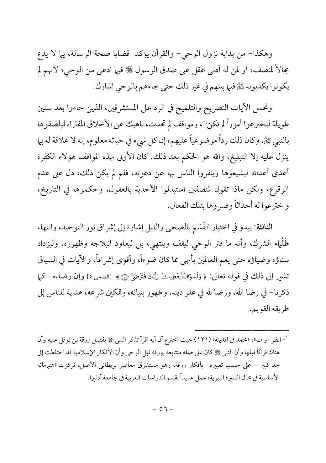 وتحمل الآيات التصريح والتلميح في الرد على المستشرقين، الذين جاءوا بعد سنين طويلة ليخترعوا أموراً لم تكن (¬1)، ومواقف لم تحدث، ناهيك عن الأخلاق المفتراه ليلصقوها بالنبي - صَلَّى اللَّهُ عَلَيْهِ وَسَلَّمَ -، وكان ذلك رداً موضوعياً عليهم، إن كل شيء في حياته معلوم، إنه لا علاقة له بما ينزل عليه إلا التبليغ، والله هو الحكم بعد ذلك. كان الأولى بهذه المواقف هؤلاء الكفرة أعدى أعدائه ليشيعوها وينفروا الناس بها عن دعوته، فلم لم يكن ذلك، دل على عدم الوقوع، ولكن ماذا تقول لمنصفين استبدلوا الأحذية بالعقول، وحكموها في التاريخ، واخترعوا له أحداثاً وفسروها بتلك الفعال.