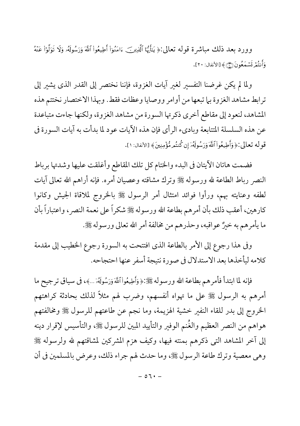 ولما لم يكن غرضنا التفسير لغير آيات الغزوة، فإننا نختصر إلى القدر الذى يشير إلى ترابط مشاهد الغزوة بما تبعها من أوامر ووصايا وعظات فقط. وبهذا الاختصار نختتم هذه المشاهد، لنعود إلى مقاطع أخرى ذكرتها السورة من مشاهد الغزوة، ولكنها جاءت متباعدة عن هذه السلسلة المتتابعة وبادىء الرأى فإن هذه الآيات عود لما بدأت به آيات السورة في قوله تعالى: {وَأَطِيعُوا اللَّهَ وَرَسُولَهُ إِنْ كُنْتُمْ مُؤْمِنِينَ} [الأنفال: 1].