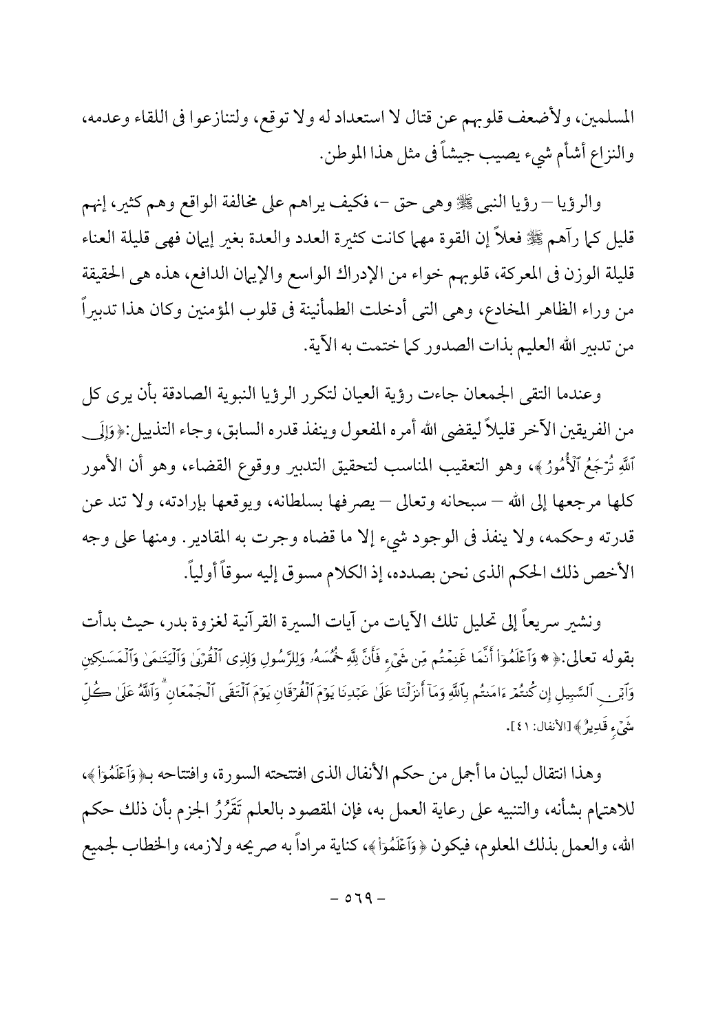 ونشير سريعاً إلى تحليل تلك الآيات من آيات السيرة القرآنية لغزوة بدر، حيث بدأت بقوله تعالى: {وَاعْلَمُوا أَنَّمَا غَنِمْتُمْ مِنْ شَيْءٍ فَأَنَّ لِلَّهِ خُمُسَهُ وَلِلرَّسُولِ وَلِذِي الْقُرْبَى وَالْيَتَامَى وَالْمَسَاكِينِ وَابْنِ السَّبِيلِ إِنْ كُنْتُمْ آَمَنْتُمْ بِاللَّهِ وَمَا أَنْزَلْنَا عَلَى عَبْدِنَا يَوْمَ الْفُرْقَانِ يَوْمَ الْتَقَى الْجَمْعَانِ وَاللَّهُ عَلَى كُلِّ شَيْءٍ قَدِيرٌ} [الأنفال: 41].