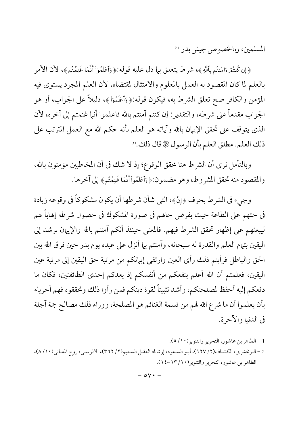 {إِنْ كُنْتُمْ آَمَنْتُمْ بِاللَّهِ}، شرط يتعلق بما دل عليه قوله: {وَاعْلَمُوا أَنَّمَا غَنِمْتُمْ}، لأن الأمر بالعلم لما كان المقصود به العمل بالمعلوم والامتثال لمقتضاه، لأن العلم المجرد يستوى فيه المؤمن والكافر صح تعلق الشرط به، فيكون قوله: {وَاعْلَمُوا}، دليلاً على الجواب، أو هو الجواب مقدماً على شرطه، والتقدير: إن كنتم آمنتم بالله فاعلموا أنما غنمتم إلى آخره، لأن الذى يتوقف على تحقق الإيمان بالله وآياته هو العلم بأنه حكم الله مع العمل المترتب على ذلك العلم. مطلق العلم بأن الرسول - صَلَّى اللَّهُ عَلَيْهِ وَسَلَّمَ - قال ذلك. (¬2)
