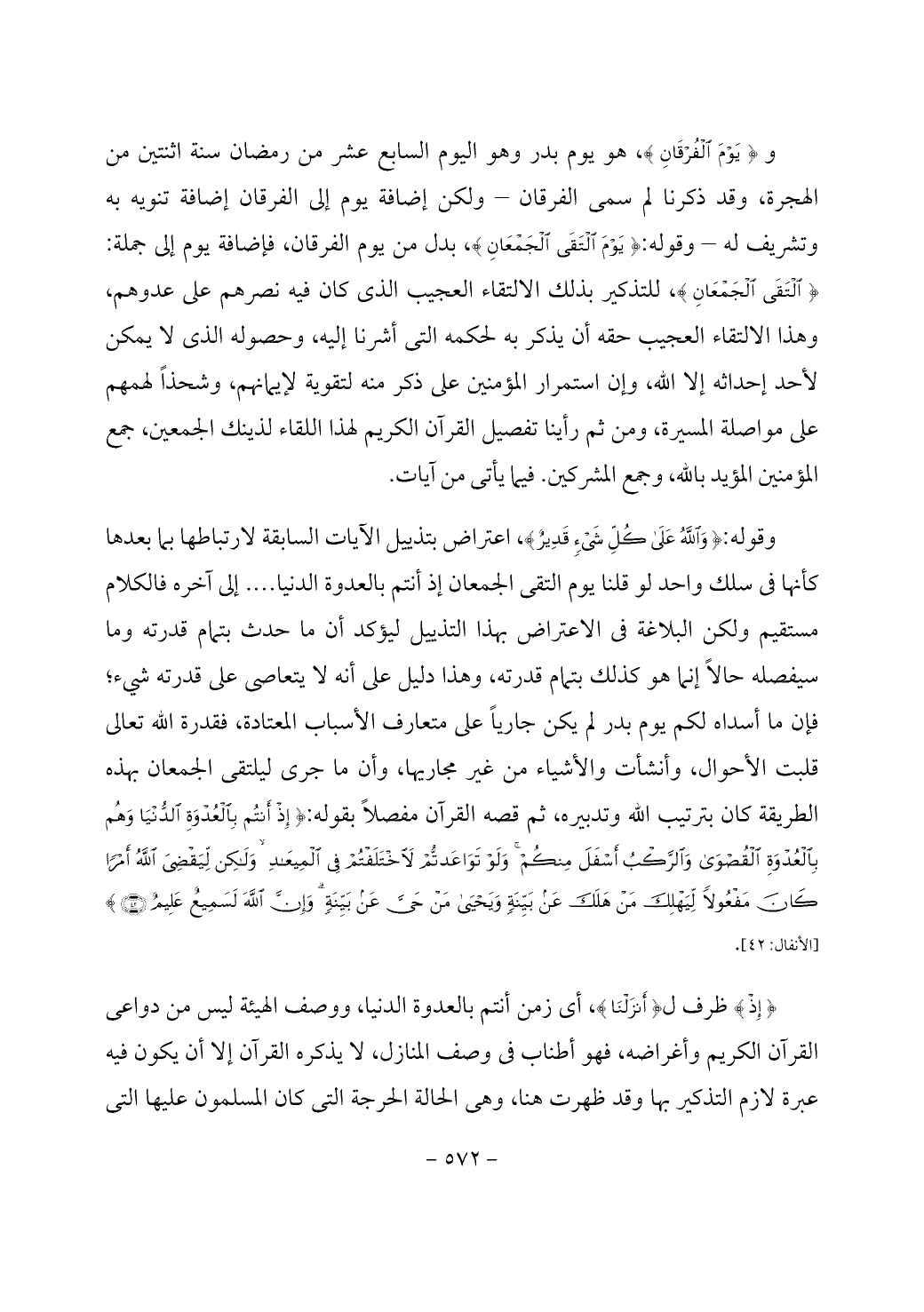 وقوله: {وَاللَّهُ عَلَى كُلِّ شَيْءٍ قَدِيرٌ}، اعتراض بتذييل الآيات السابقة لارتباطها بما بعدها كأنها في سلك واحد لو قلنا يوم التقى الجمعان إذ أنتم بالعدوة الدنيا .... إلى آخره فالكلام مستقيم ولكن البلاغة في الاعتراض بهذا التذييل ليؤكد أن ما حدث بتمام قدرته وما سيفصله حالاً إنما هو كذلك بتمام قدرته، وهذا دليل على أنه لا يتعاصى على قدرته شيء؛ فإن ما أسداه لكم يوم بدر لم يكن جارياً على متعارف الأسباب المعتادة، فقدرة الله تعالى قلبت الأحوال، وأنشأت والأشياء من غير مجاريها، وأن ما جرى ليلتقى الجمعان بهذه الطريقة كان بترتيب الله وتدبيره، ثم قصه القرآن مفصلاً بقوله: {إِذْ أَنْتُمْ بِالْعُدْوَةِ الدُّنْيَا وَهُمْ بِالْعُدْوَةِ الْقُصْوَى وَالرَّكْبُ أَسْفَلَ مِنْكُمْ وَلَوْ تَوَاعَدْتُمْ لَاخْتَلَفْتُمْ فِي الْمِيعَادِ وَلَكِنْ لِيَقْضِيَ اللَّهُ أَمْرًا كَانَ مَفْعُولًا لِيَهْلِكَ مَنْ هَلَكَ عَنْ بَيِّنَةٍ وَيَحْيَى مَنْ حَيَّ عَنْ بَيِّنَةٍ وَإِن اللَّهَ لَسَمِيعٌ عَلِيمٌ (42)} [الأنفال: 42].