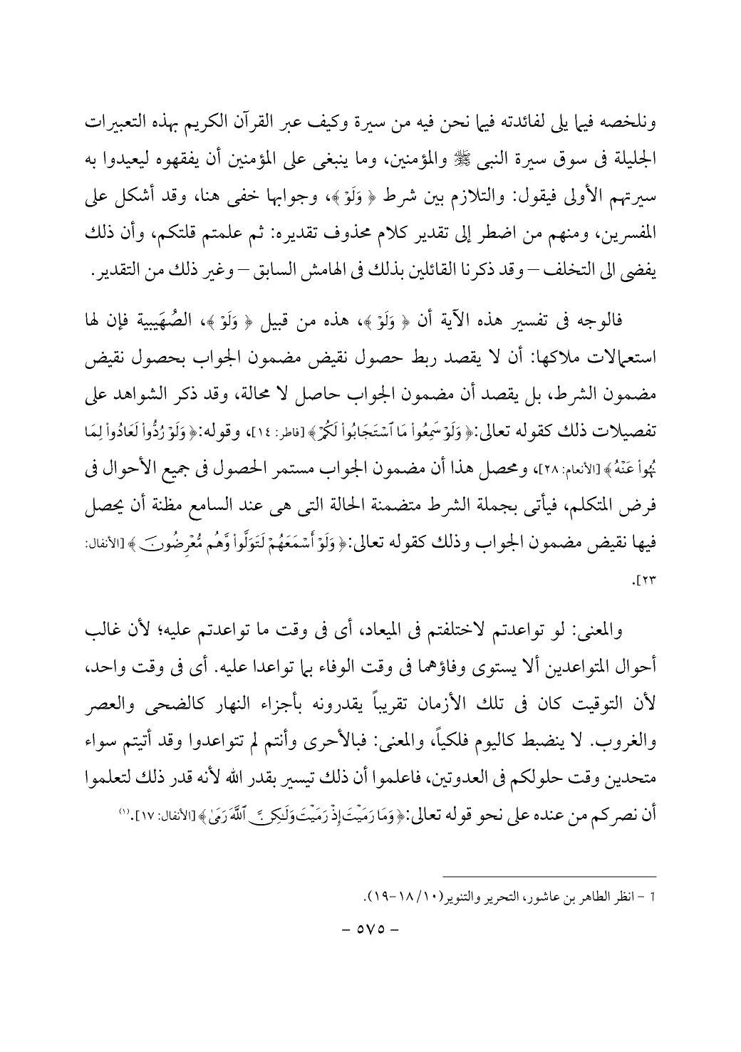 ونلخصه فيما يلى لفائدته فيما نحن فيه من سيرة وكيف عبر القرآن الكريم بهذه التعبيرات الجليلة في سوق سيرة النبي - صَلَّى اللَّهُ عَلَيْهِ وَسَلَّمَ - والمؤمنين، وما ينبغى على المؤمنين أن يفقهوه ليعيدوا به سيرتهم الأولى فيقول: والتلازم بين شرط {وَلَوْ}، وجوابها خفى هنا، وقد أشكل على المفسرين، ومنهم من اضطر إلى تقدير كلام محذوف تقديره: ثم علمتم قلتكم، وأن ذلك يفضى إلى التخلف – وقد ذكرنا القائلين بذلك في الهامش السابق – وغير ذلك من التقدير.
