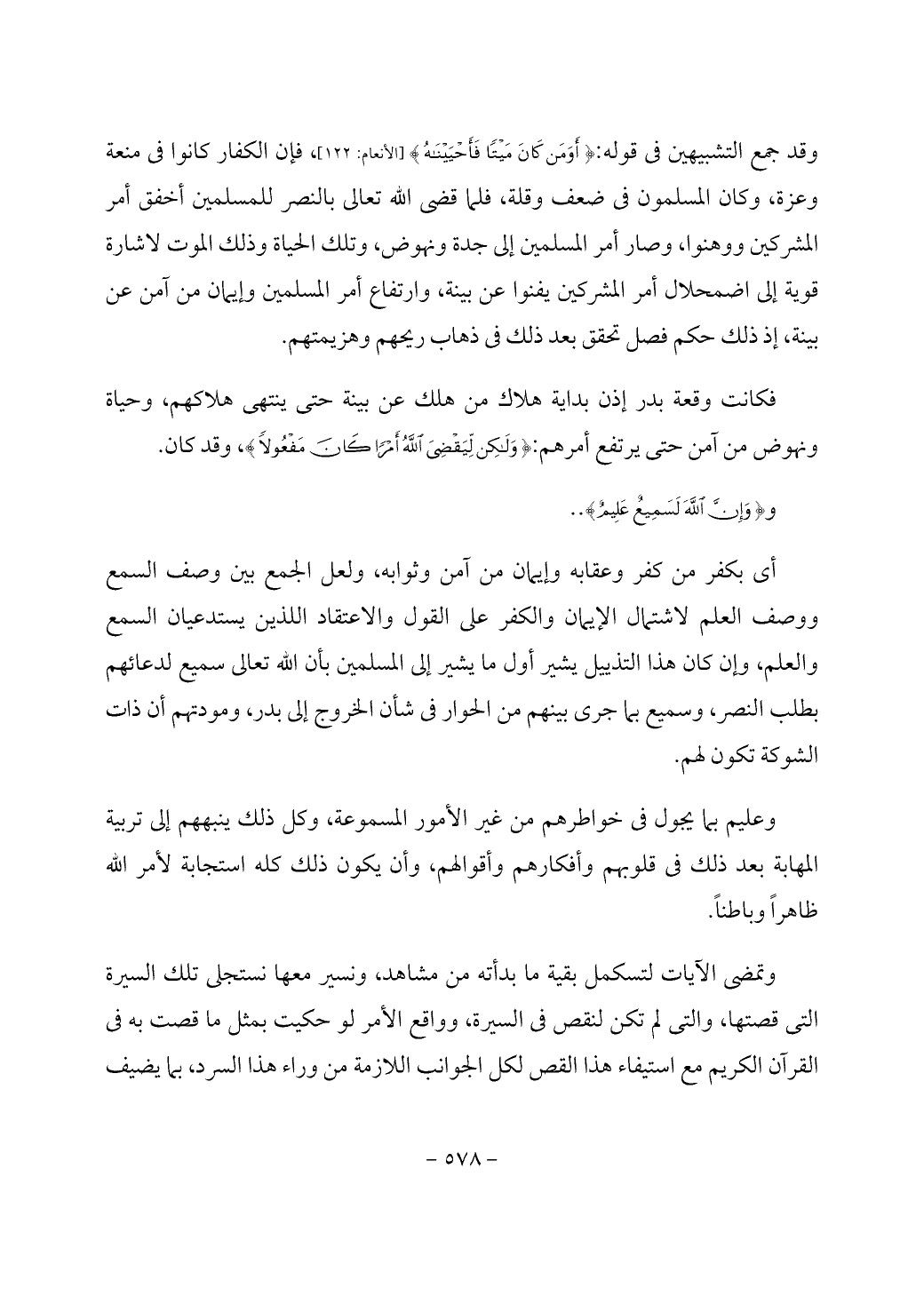 وقد جمع التشبيهين في قوله: {أَوَمَنْ كَانَ مَيْتًا فَأَحْيَيْنَاهُ} [الأنعام: 122]، فإن الكفار كانوا في منعة وعزة، وكان المسلمون في ضعف وقلة، فلما قضى الله تعالى بالنصر للمسلمين أخفق أمر المشركين ووهنوا، وصار أمر المسلمين إلى جدة ونهوض، وتلك الحياة وذلك الموت لاشارة قوية إلى اضمحلال أمر المشركين يفنوا عن بينة، وارتفاع أمر المسلمين وإيمان من آمن عن بينة، إذ ذلك حكم فصل تحقق بعد ذلك في ذهاب ريحهم وهزيمتهم.