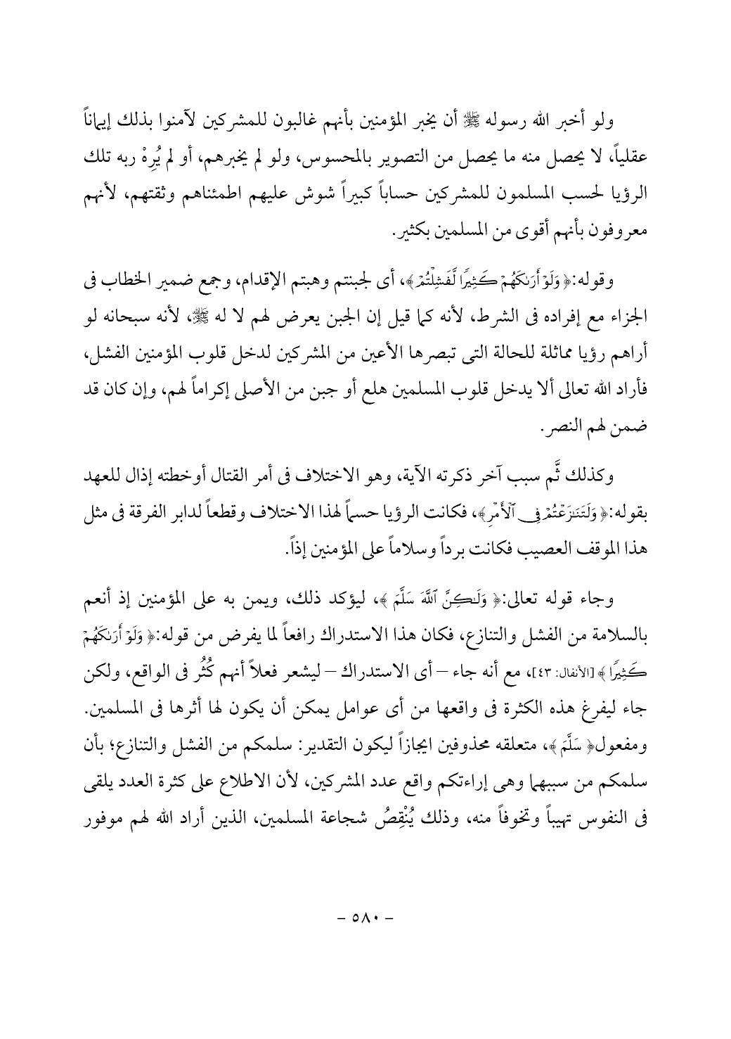 وقوله: {وَلَوْ أَرَاكَهُمْ كَثِيرًا لَفَشِلْتُمْ}، أي لجبنتم وهبتم الإقدام، وجمع ضمير الخطاب في الجزاء مع إفراده في الشرط، لأنه كما قيل إن الجبن يعرض لهم لا له - صَلَّى اللَّهُ عَلَيْهِ وَسَلَّمَ -، لأنه سبحانه لو أراهم رؤيا مماثلة للحالة التى تبصرها الأعين من المشركين لدخل قلوب المؤمنين الفشل، فأراد الله تعالى ألا يدخل قلوب المسلمين هلع أو جبن من الأصلى إكراماً لهم، وإن كان قد ضمن لهم النصر.