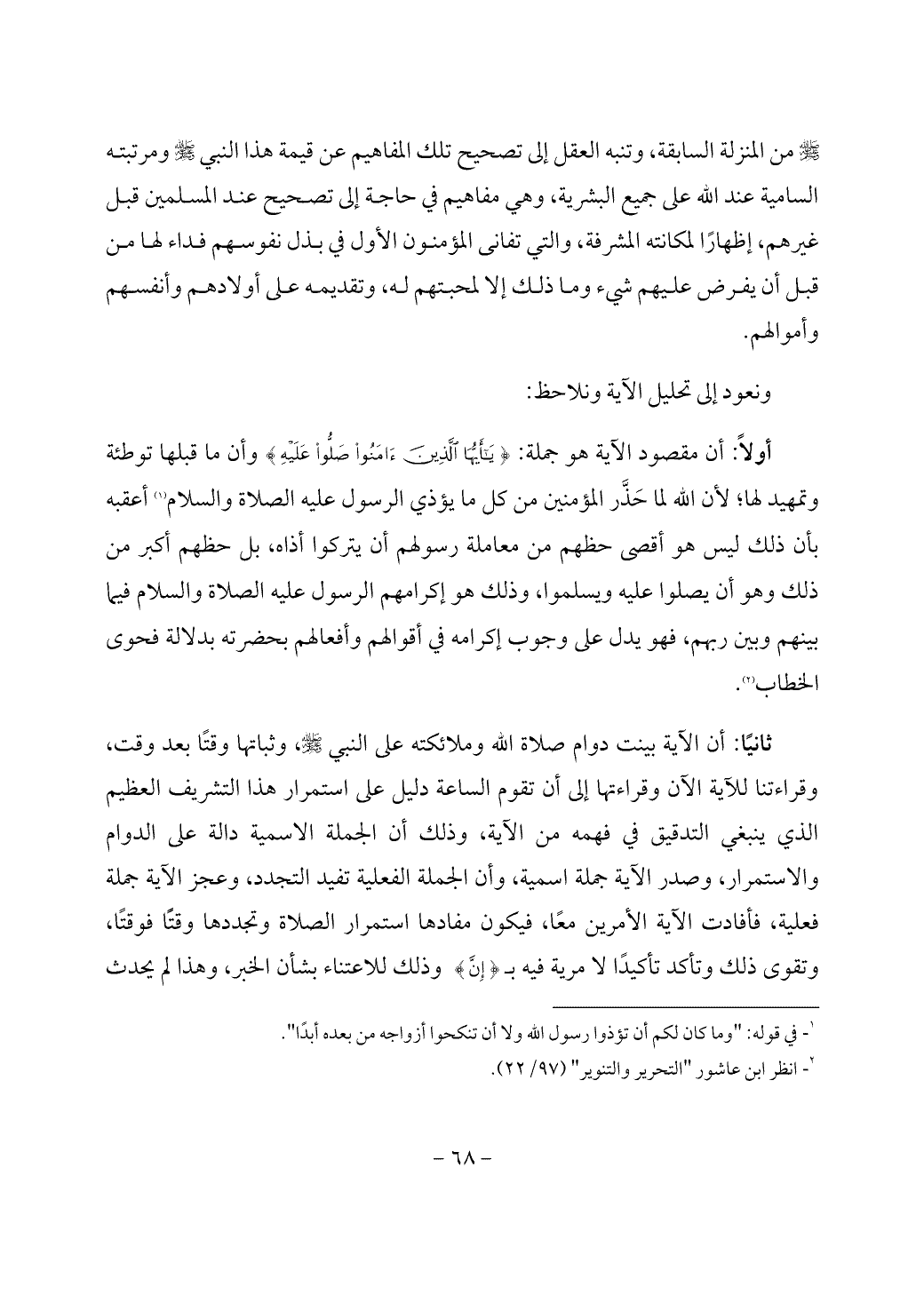 ثانيًا: أن الآية بينت دوام صلاة الله وملائكته على النبي - صَلَّى اللَّهُ عَلَيْهِ وَسَلَّمَ -، وثباتها وقتًا بعد وقت، وقراءتنا للآية الآن وقراءتها إلى أن تقوم الساعة دليل على استمرار هذا التشريف العظيم الذي ينبغي التدقيق في فهمه من الآية، وذلك أن الجملة الاسمية دالة على الدوام والاستمرار، وصدر الآية جملة اسمية، وأن الجملة الفعلية تفيد التجدد، وعجز الآية جملة فعلية، فأفادت الآية الأمرين معًا، فيكون مفادها استمرار الصلاة وتجددها وقتًا فوقتًا، وتقوى ذلك وتأكد تأكيدًا لا مرية فيه بـ {إِنَّ} وذلك للاعتناء بشأن الخبر، وهذا لم يحدث