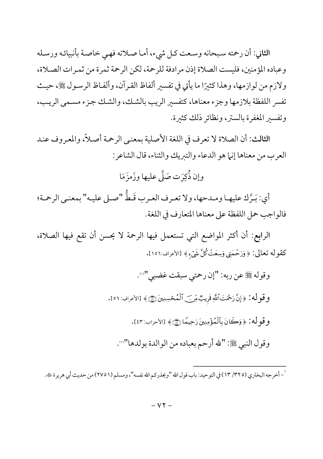 الثاني: أن رحمته سبحانه وسعت كل شيء، أما صلاته فهي خاصة بأنبيائه ورسله وعباده المؤمنين، فليست الصلاة إذن مرادفة للرحمة، لكن الرحمة ثمرة من ثمرات الصلاة، ولازم من لوازمها، وهذا كثيرًا ما يأتي في تفسير ألفاظ القرآن، وألفاظ الرسول - صَلَّى اللَّهُ عَلَيْهِ وَسَلَّمَ -، حيث تفسر اللفظة بلازمها وجزء معناها، كتفسير الريب بالشك، والشك جزء مسمى الريب، وتفسير المغفرة بالستر، ونظائر ذلك كثيرة.
