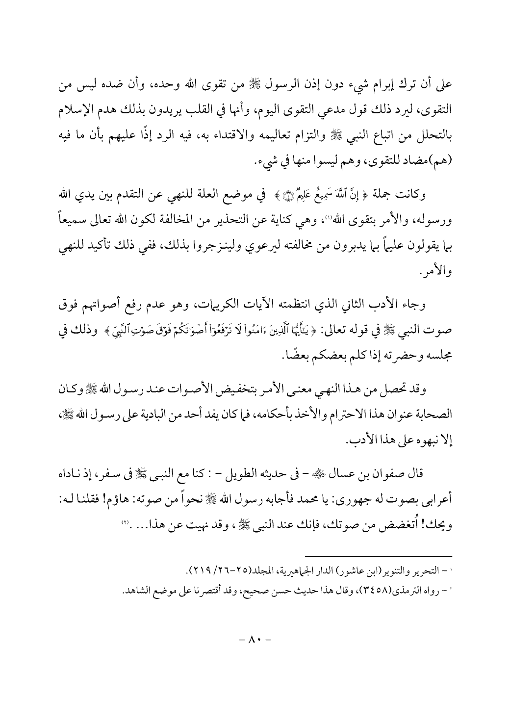 وجاء الأدب الثاني الذي انتظمته الآيات الكريمات، وهو عدم رفع أصواتهم فوق صوت النبي - صَلَّى اللَّهُ عَلَيْهِ وَسَلَّمَ - في قوله تعالى: {يَا أَيُّهَا الَّذِينَ آَمَنُوا لَا تَرْفَعُوا أَصْوَاتَكُمْ فَوْقَ صَوْتِ النَّبِيِّ} وذلك في مجلسه وحضرته إذا كلم بعضكم بعضًا.