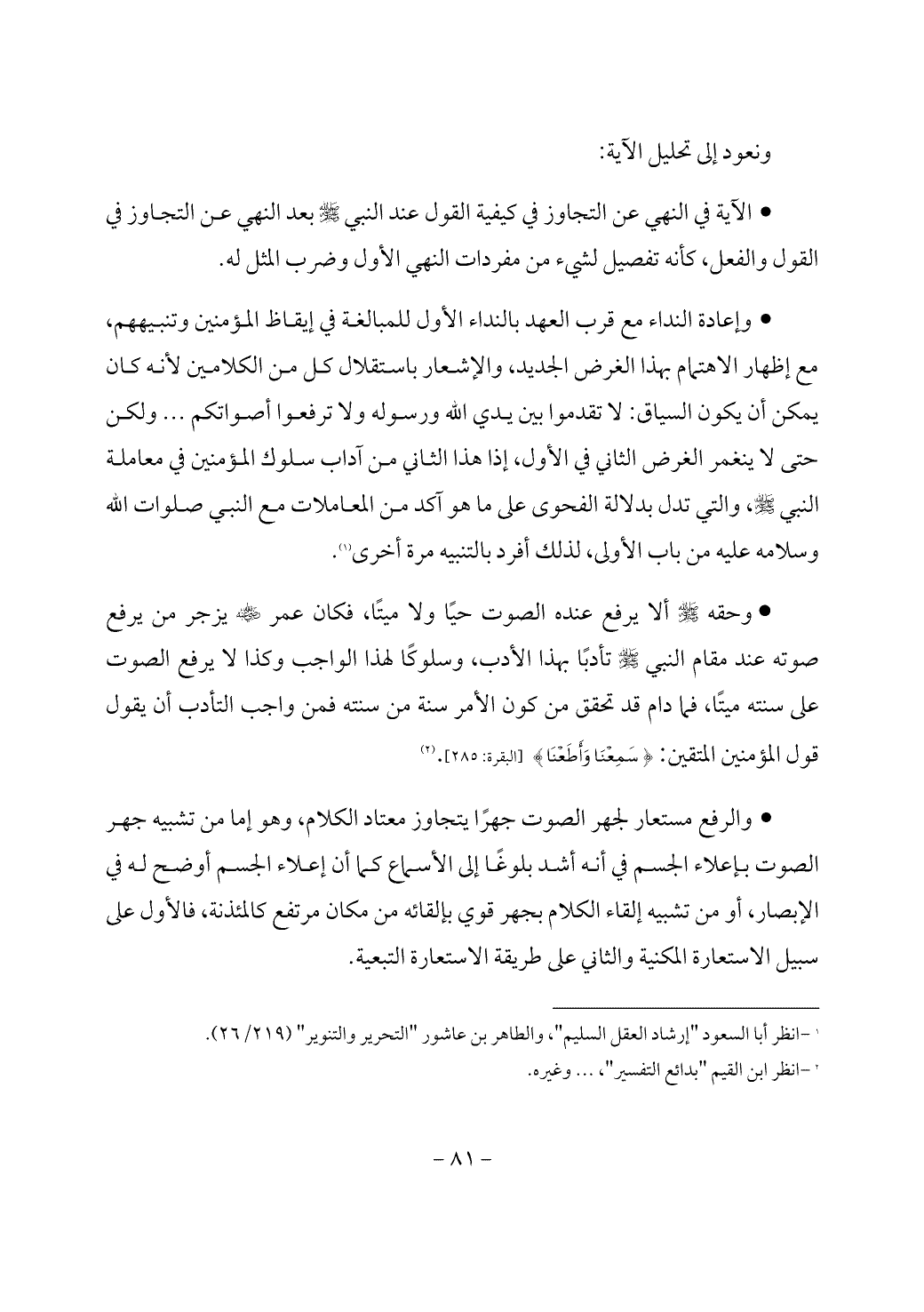 - الآية في النهي عن التجاوز في كيفية القول عند النبي - صَلَّى اللَّهُ عَلَيْهِ وَسَلَّمَ - بعد النهي عن التجاوز في القول والفعل، كأنه تفصيل لشيء من مفردات النهي الأول وضرب المثل له.