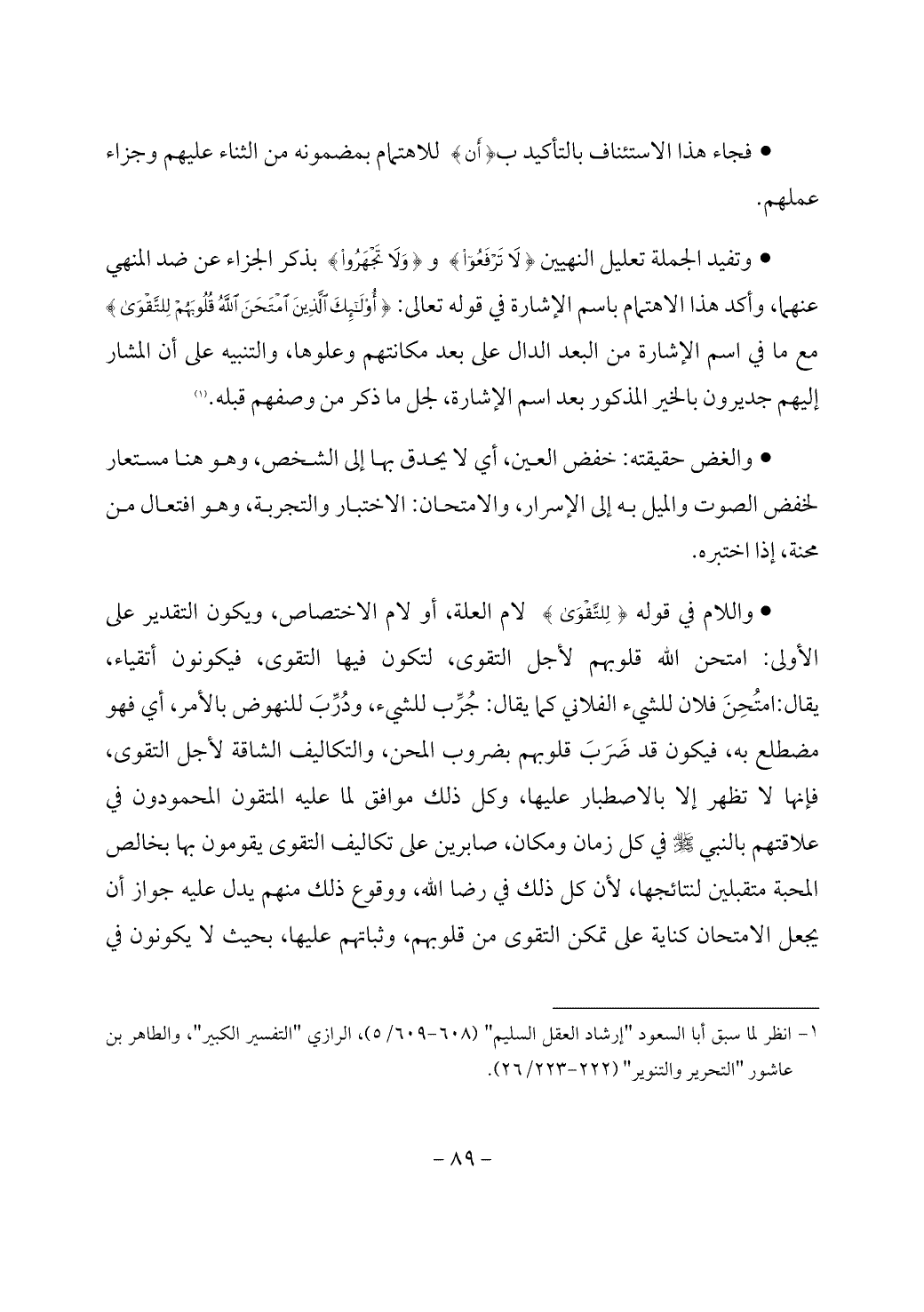 - واللام في قوله {لِلتَّقْوَى} لام العلة، أو لام الاختصاص، ويكون التقدير على الأولى: امتحن الله قلوبهم لأجل التقوى، لتكون فيها التقوى، فيكونون أتقياء، يقال: امتُحِنَ فلان للشيء الفلاني كما يقال: جُرِّب للشيء، ودُرِّبَ للنهوض بالأمر، أي فهو مضطلع به، فيكون قد ضَرَبَ قلوبهم بضروب المحن، والتكاليف الشاقة لأجل التقوى، فإنها لا تظهر إلا بالاصطبار عليها، وكل ذلك موافق لما عليه المتقون المحمودون في علاقتهم بالنبي - صَلَّى اللَّهُ عَلَيْهِ وَسَلَّمَ - في كل زمان ومكان، صابرين على تكاليف التقوى يقومون بها بخالص المحبة متقبلين لنتائجها، لأن كل ذلك في رضا الله، ووقوع ذلك منهم يدل عليه جواز أن يجعل الامتحان كناية على تمكن التقوى من قلوبهم، وثباتهم عليها، بحيث لا يكونون في