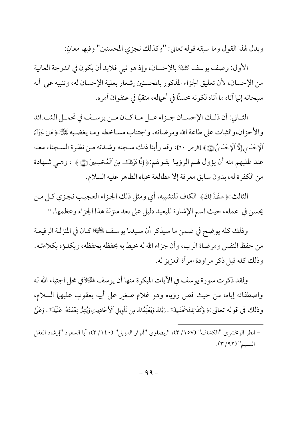 الأول: وصف يوسف - عليه السلام - بالإحسان، وإذ هو نبي فلابد أن يكون في الدرجة العالية من الإحسان، لأن تعليق الجزاء المذكور بالمحسنين إشعار بعلية الإحسان له، وتنبيه على أنه سبحانه إنما آتاه ما آتاه لكونه محسنًا في أعماله، متقيًا في عنفوان أمره.