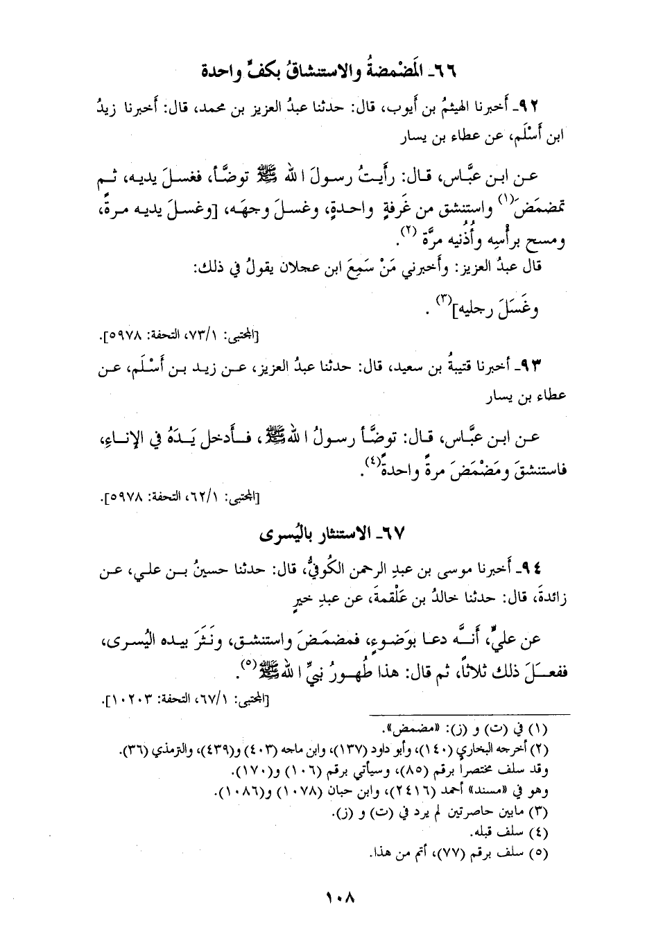 93 - أَخْبَرَنَا قُتَيْبَةُ بْنُ سَعِيدٍ، قَالَ: حَدَّثَنَا عَبْدُ الْعَزِيزِ، عَنْ زَيْدِ بْنِ أَسْلَمَ، عَنْ عَطَاءِ بْنِ يَسَارٍ، عَنِ ابْنِ عَبَّاسٍ، قَالَ: «§تَوَضَّأَ رَسُولُ اللهِ صَلَّى اللهُ عَلَيْهِ وَسَلَّمَ فَأَدْخَلَ يَدَهُ فِي الْإِنَاءِ فَاسْتَنْشَقَ وَمَضْمَضَ مَرَّةً وَاحِدَةً»