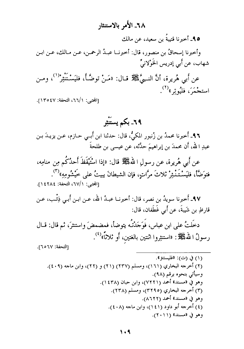 95 - أَخْبَرَنَا قُتَيْبَةُ بْنُ سَعِيدٍ، عَنْ مَالِكٍ، وَأَخْبَرَنَا إِسْحَاقُ بْنُ مَنْصُورٍ، قَالَ: أَخْبَرَنَا عَبْدُ الرَّحْمَنِ، عَنْ مَالِكٍ، عَنِ ابْنِ شِهَابٍ، عَنْ أَبِي إِدْرِيسَ الْخَوْلَانِيِّ، عَنْ أَبِي هُرَيْرَةَ، أَنَّ النَّبِيَّ صَلَّى اللهُ عَلَيْهِ وَسَلَّمَ، قَالَ: «§مَنْ تَوَضَّأَ فَلْيَسْتَنْثِرْ، وَمَنِ اسْتَجْمَرَ فَلْيُوتِرْ»
