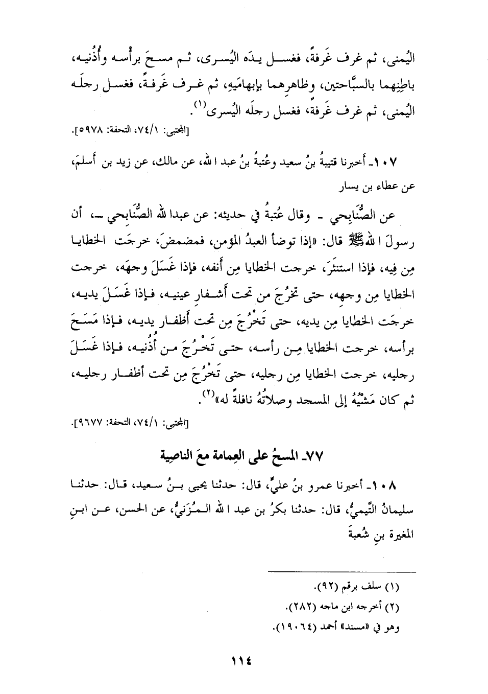 107 - أَخْبَرَنَا قُتَيْبَةُ بْنُ سَعِيدٍ، وَعُتْبَةُ بْنُ عَبْدِ اللهِ، عَنْ مَالِكٍ، عَنْ زَيْدِ بْنِ أَسْلَمَ، عَنْ عَطَاءِ بْنِ يَسَارٍ، عَنْ الصُّنَابِحِيّ، وَقَالَ عُتْبَةُ فِي حَدِيثِهِ، عَنْ عَبْدِ اللهِ الصُّنَابِحِيِّ، أَنَّ رَسُولَ اللهِ صَلَّى اللهُ عَلَيْهِ وَسَلَّمَ، قَالَ: «§إِذَا تَوَضَّأَ الْعَبْدُ الْمُؤْمِنُ فَمَضْمَضَ خَرَجْتِ الْخَطَايَا مِنْ فِيهِ، فَإِذَا اسْتَنْثَرَ خَرَجْتِ الْخَطَايَا مِنْ أَنْفِهِ، فَإِذَا غَسَلَ وَجْهَهُ خَرَجْتِ الْخَطَايَا مِنْ وَجْهِهِ حَتَّى تَخْرُجَ مِنْ تَحْتِ أَشْفَارِ عَيْنَيْهِ، فَإِذَا غَسَلَ يَدَيْهِ خَرَجْتِ الْخَطَايَا مِنْ يَدَيْهِ حَتَّى تَخْرُجَ مِنْ تَحْتِ أَظْفَارِ يَدَيْهِ، فَإِذَا مَسَحَ بِرَأْسِهِ خَرَجْتِ الْخَطَايَا مِنْ رَأْسِهِ حَتَّى تَخْرُجَ مِنْ أُذُنَيْهِ، فَإِذَا غَسَلَ رِجْلَيْهِ خَرَجْتِ الْخَطَايَا مِنْ رِجْلَيْهِ حَتَّى تَخْرُجَ مِنْ تَحْتِ أَظْفَارِ رِجْلَيْهِ، ثُمَّ كَانَ مَشْيُهُ إِلَى الْمَسْجِدِ وَصَلَاتِهِ نَافِلَةً لَهُ»