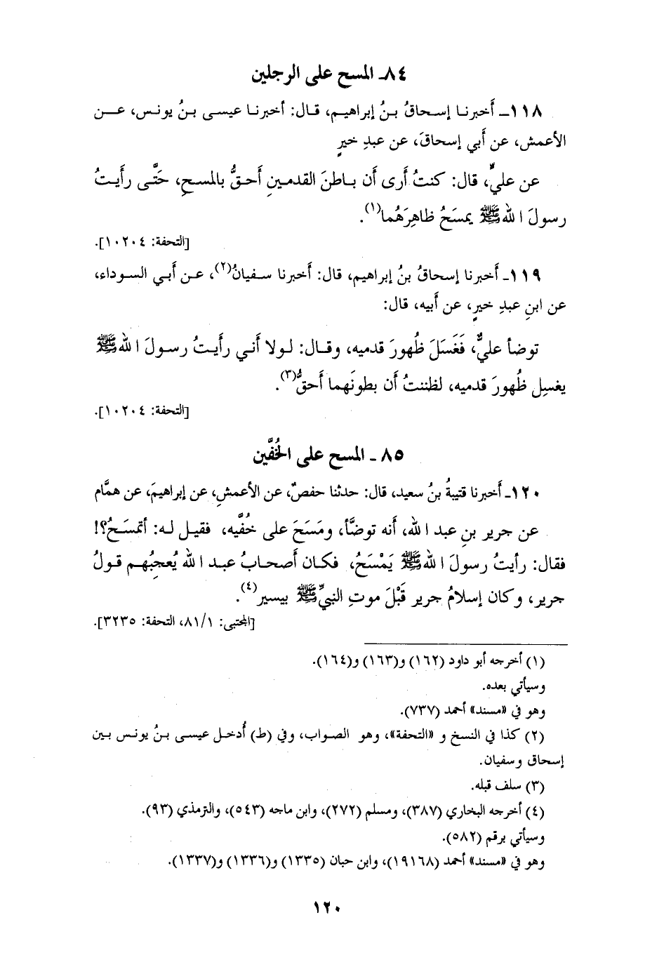 118 - أَخْبَرَنَا إِسْحَاقُ بْنُ إِبْرَاهِيمَ، قَالَ: أَخْبَرَنَا عِيسَى بْنُ يُونُسَ، عَنِ الْأَعْمَشِ، عَنْ أَبِي إِسْحَاقَ، عَنْ عَبْدِ خَيْرٍ، عَنْ عَلِيٍّ، قَالَ: كُنْتُ أَرَى أَنَّ بَاطِنَ الْقَدَمَيْنِ أَحَقُّ بِالْمَسْحِ حَتَّى «§رَأَيْتُ رَسُولَ اللهِ صَلَّى اللهُ عَلَيْهِ وَسَلَّمَ يَمْسَحُ ظَاهِرَهُمَا»