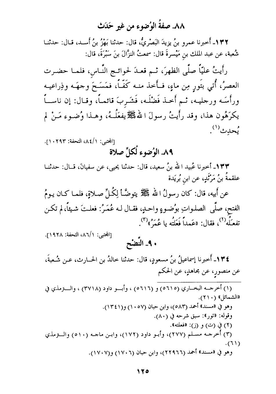 132 - أَخْبَرَنَا عَمْرُو بْنُ يَزِيدَ الْبَصْرِيُّ، قَالَ: حَدَّثَنَا بَهْزُ بْنُ أَسَدٍ، قَالَ: حَدَّثَنَا شُعْبَةُ، عَنْ عَبْدِ الْمَلِكِ بْنِ مَيْسَرَةَ، قَالَ: سَمِعْتُ النَّزَّالَ بْنَ سَبْرَةَ، قَالَ: رَأَيْتُ عَلِيًّا صَلَّى الظُّهْرَ، ثُمَّ قَعَدَ لِحَوَائِجِ النَّاسِ، " §فَلَمَّا حَضَرَتِ الْعَصْرُ أُتِيَ بِتَوْرٍ مِنْ مَاءٍ، فَأَخَذَ مِنْهُ كَفًّا فَمَسَحَ وَجْهَهُ وَذِرَاعَيْهِ وَرَأْسَهُ وَرِجْلَيْهِ، ثُمَّ أَخَذَ فَضْلَهُ فَشَرِبَ قَائِمًا، وَقَالَ: إِنَّ نَاسًا يَكْرَهُونَ هَذَا، وَقَدْ رَأَيْتُ رَسُولَ اللهِ صَلَّى اللهُ عَلَيْهِ وَسَلَّمَ يَفْعَلُهُ، وَهَذَا وُضُوءُ مَنْ لَمْ يُحْدِثْ "