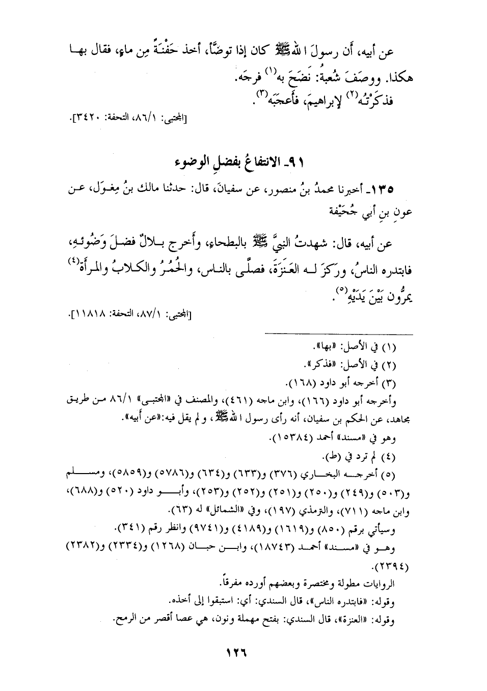135 - أَخْبَرَنَا مُحَمَّدُ بْنُ مَنْصُورٍ، عَنْ سُفْيَانَ، قَالَ: حَدَّثَنَا مَالِكُ بْنُ مِغْوَلٍ، عَنْ عَوْنِ بْنِ أَبِي جُحَيْفَةَ، عَنْ أَبِيهِ، قَالَ: شَهِدْتُ النَّبِيَّ صَلَّى اللهُ عَلَيْهِ وَسَلَّمَ بِالْبَطْحَاءِ، «§وَأَخْرَجَ بِلَالٌ فَضْلَ وَضُوئِهِ فَابْتَدَرَهُ النَّاسُ، وَرَكَزَ لَهُ الْعَنَزَةَ، فَصَلَّى بِالنَّاسِ وَالْحُمُرُ وَالْكِلَابُ وَالْمَرْأَةُ يَمُرُّونَ بَيْنَ يَدَيْهِ»