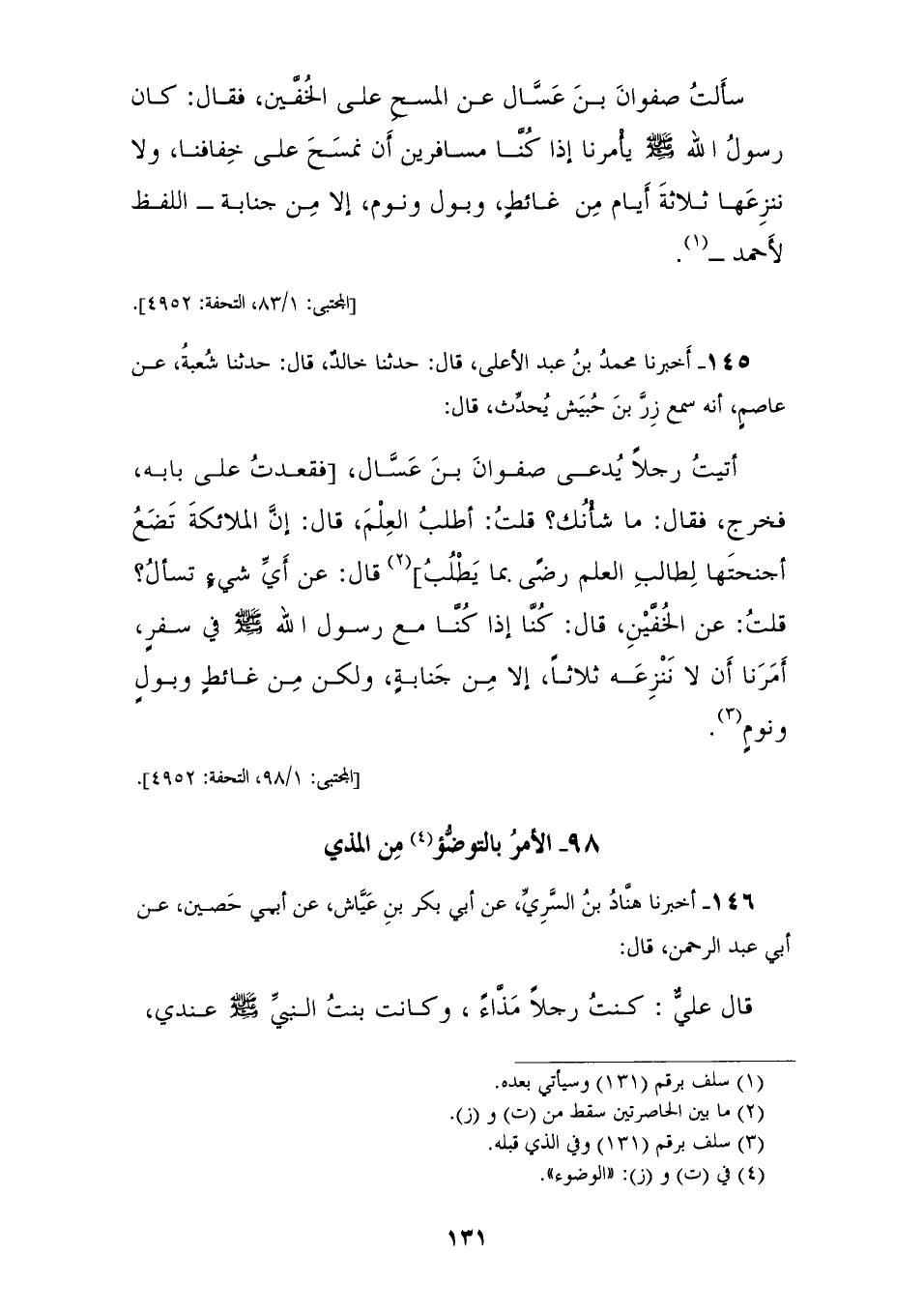 145 - أَخْبَرَنَا مُحَمَّدُ بْنُ عَبْدِ الْأَعْلَى، قَالَ: حَدَّثَنَا خَالِدٌ، قَالَ: حَدَّثَنَا شُعْبَةُ، عَنْ عَاصِمٍ، أَنَّهُ سَمِعَ زِرِّ بْنِ حُبَيْشٍ، يُحَدِّثُ، قَالَ: أَتَيْتُ رَجُلًا يُدْعَى صَفْوَانُ بْنُ عَسَّالٍ فَقَعَدْتُ عَلَى بَابِهِ فَخَرَجَ، فَقَالَ: مَا شَأْنُكَ؟ قُلْتُ: أَطْلُبُ الْعِلْمَ، قَالَ: إِنَّ الْمَلَائِكَةَ تَضَعُ أَجْنِحَتَهَا لِطَالِبِ الْعِلْمِ رِضًى بِمَا يَطْلُبُ، قَالَ: عَنْ أَيِّ شَيْءٍ تَسْأَلُ؟ قُلْتُ: عَنِ الْخُفَّيْنِ، قَالَ: كُنَّا إِذَا كُنَّا مَعَ رَسُولِ اللهِ صَلَّى اللهُ عَلَيْهِ وَسَلَّمَ فِي سَفَرٍ «§أَمَرَنَا أَنْ لَا نَنْزِعَهُ ثَلَاثًا إِلَّا مِنْ جَنَابَةٍ، وَلَكِنْ مِنْ غَائِطٍ وَبَوْلٍ وَنَوْمٍ»