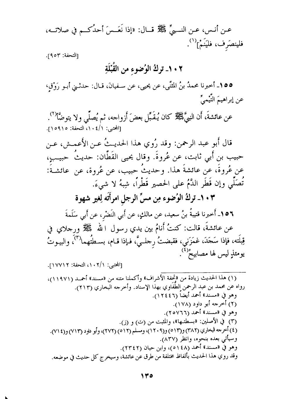 155 - أَخْبَرَنَا مُحَمَّدُ بْنُ الْمُثَنَّى، عَنْ يَحْيَى، عَنْ سُفْيَانَ، قَالَ: حَدَّثَنِي أَبُو رَوْقٍ، عَنْ إِبْرَاهِيمَ التَّيْمِيِّ، عَنْ عَائِشَةَ، أَنَّ النَّبِيَّ صَلَّى اللهُ عَلَيْهِ وَسَلَّمَ كَانَ «§يُقَبِّلُ بَعْضَ أَزْوَاجِهِ، ثُمَّ يُصَلِّي وَلَا يَتَوَضَّأُ» قَالَ أَبُو عَبْدِ الرَّحْمَنِ وَقَدْ رُوِيَ هَذَا الْحَدِيثُ عَنِ الْأَعْمَشِ، عَنْ حَبِيبِ بْنِ أَبِي ثَابِتٍ، عَنْ عُرْوَةَ، وَقَالَ: يَحْيَى الْقَطَّانُ، حَدِيثُ حَبِيبٍ، عَنْ عُرْوَةَ، عَنْ عَائِشَةَ هَذَا، وَحَدِيثُ حَبِيبٍ، عَنْ عُرْوَةَ، عَنْ عَائِشَةَ تُصَلِّي وَإِنْ قَطَّرَ الدَّمُ عَلَى الْحَصِيرِ قَطْرًا شِبْهُ لَا شَيْءٍ