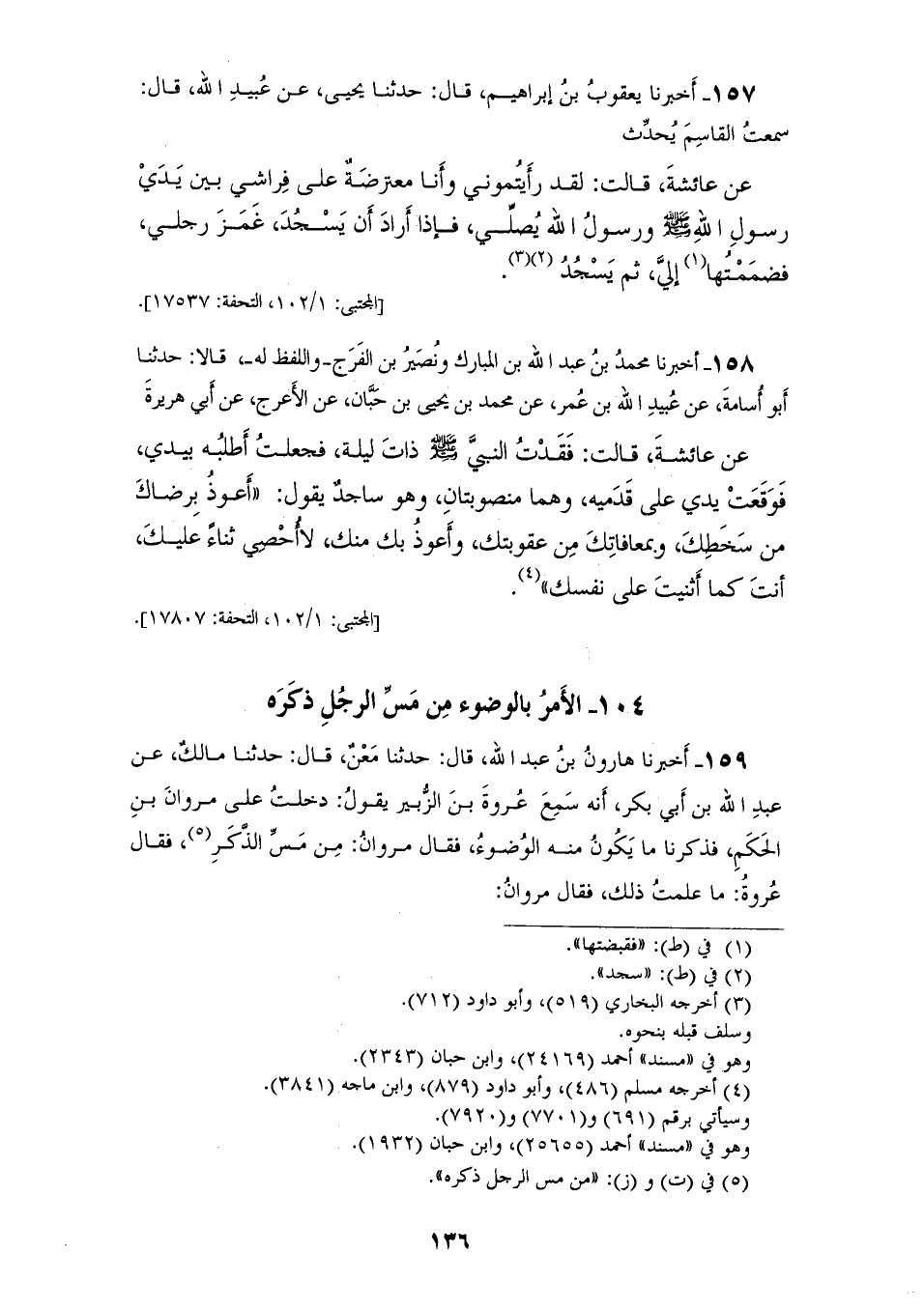 158 - أَخْبَرَنَا مُحَمَّدُ بْنُ عَبْدِ اللهِ بْنِ الْمُبَارَكِ، وَنُصَيْرُ بْنُ الْفَرَجِ وَاللَّفْظُ لَهُ قَالَا: حَدَّثَنَا أَبُو أُسَامَةَ، عَنْ عُبَيْدِ اللهِ بْنِ عُمَرَ، عَنْ مُحَمَّدِ بْنِ يَحْيَى بْنِ حَبَّانَ، عَنِ الْأَعْرَجِ، عَنْ أَبِي هُرَيْرَةَ، عَنْ عَائِشَةَ، قَالَتْ: فَقَدْتُ النَّبِيَّ صَلَّى اللهُ عَلَيْهِ وَسَلَّمَ ذَاتَ لَيْلَةٍ، فَجَعَلْتُ أَطْلُبُهُ بِيَدِي فَوَقَعَتْ يَدِي عَلَى قَدَمَيْهِ وَهُمَا مَنْصُوبَتَانِ، وَهُوَ سَاجِدٌ، يَقُولُ: «§أَعُوذُ بِرِضَاكَ مِنْ سَخَطِكَ وَبِمُعَافَاتِكَ مِنْ عُقُوبَتِكَ، وَأَعُوذُ بِكَ مِنْكَ، لَا أُحْصِي ثَنَاءً عَلَيْكَ أَنْتَ كَمَا أَثْنَيْتَ عَلَى نَفْسِكَ»