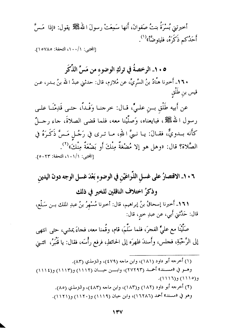 160 - أَخْبَرَنَا هَنَّادُ بْنُ السَّرِيِّ، عَنْ مُلَازِمٍ، قَالَ: حَدَّثَنِي عَبْدُ اللهِ بْنُ بَدْرٍ، عَنْ قَيْسِ بْنِ طَلْقٍ، عَنْ أَبِيهِ طَلْقِ بْنِ عَلِيٍّ، قَالَ: خَرَجْنَا وَفْدًا حَتَّى قَدِمْنَا عَلَى رَسُولِ اللهِ صَلَّى اللهُ عَلَيْهِ وَسَلَّمَ فَبَايَعْنَاهُ وَصَلَّيْنَا مَعَهُ، فَلَمَّا قَضَى الصَّلَاةَ جَاءَ رَجُلٌ كَأَنَّهُ بَدَوِيٌّ، فَقَالَ: يَا نَبِيَّ اللهِ، " §مَا تَرَى فِي رَجُلٍ مَسَّ ذَكَرَهُ فِي الصَّلَاةِ؟ قَالَ: «وَهَلْ هُوَ إِلَّا مُضْغَةٌ مِنْكَ أَوْ بِضْعَةٌ مِنْكَ؟»