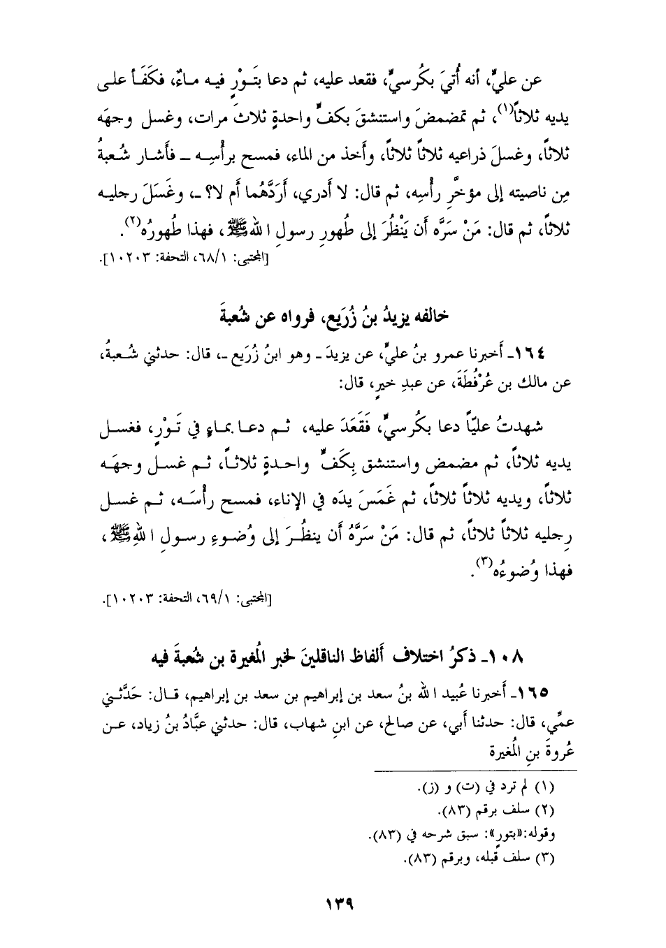 163 - أَخْبَرَنَا سُوَيْدُ بْنُ نَصْرٍ، قَالَ: أَخْبَرَنَا عَبْدُ اللهِ، عَنْ شُعْبَةَ، عَنْ مَالِكِ بْنِ عُرْفُطَةَ، عَنْ عَبْدِ خَيْرٍ، عَنْ عَلِيٍّ، أَنَّهُ " §أُتِيَ بِكُرْسِيٍّ فَقَعَدَ عَلَيْهِ، ثُمَّ دَعَا بِتَوْرٍ فِيهِ مَاءٌ فَكَفَأَ عَلَى يَدَيْهِ ثَلَاثًا، ثُمَّ تَمَضْمَضَ وَاسْتَنْشَقَ بِكَفٍّ وَاحِدَةٍ ثَلَاثَ مَرَّاتٍ، وَغَسَلَ وَجْهَهُ ثَلَاثًا، وَغَسَلَ ذِرَاعَيْهِ ثَلَاثًا ثَلَاثًا، وَأَخَذَ مِنَ الْمَاءِ فَمَسَحَ بِرَأْسِهِ فَأَشَارَ شُعْبَةُ مِنْ نَاصِيَتِهِ إِلَى مُؤَخَّرِ رَأْسِهِ، ثُمَّ قَالَ: لَا أَدْرِي أَرَدَّهُمَا أَمْ لَا، وَغَسَلَ رِجْلَيْهِ ثَلَاثًا، ثُمَّ قَالَ: مَنْ سَرَّهُ أَنْ يَنْظُرَ إِلَى طُهُورِ رَسُولِ اللهِ صَلَّى اللهُ عَلَيْهِ وَسَلَّمَ فَهَذَا طُهُورُهُ " خَالَفَهُ يَزِيدُ بْنُ زُرَيْعٍ، فَرَوَاهُ عَنْ شُعْبَةَ،
