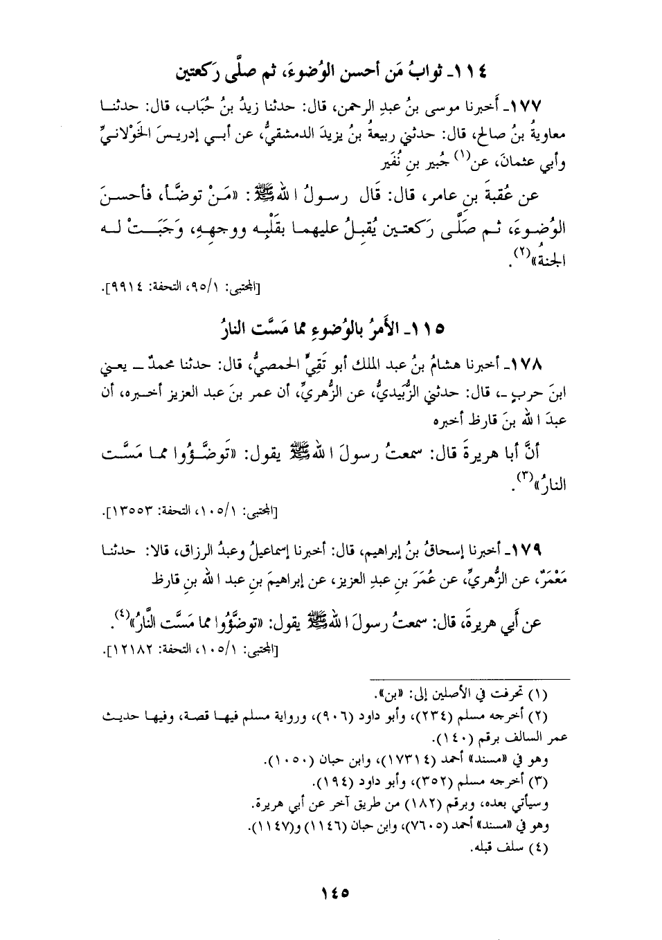 177 - أَخْبَرَنَا مُوسَى بْنُ عَبْدِ الرَّحْمَنِ، قَالَ: حَدَّثَنَا زَيْدُ بْنُ حُبَابٍ، قَالَ: حَدَّثَنَا مُعَاوِيَةُ بْنُ صَالِحٍ، قَالَ: حَدَّثَنِي رَبِيعَةُ بْنُ يَزِيدَ الدِّمَشْقِيُّ، عَنْ أَبِي إِدْرِيسَ الْخَوْلَانِيِّ، وَأَبِي عُثْمَانَ، عَنْ جُبَيْرِ بْنِ نُفَيْرٍ، عَنْ عُقْبَةَ بْنِ عَامِرٍ، قَالَ: قَالَ رَسُولُ اللهِ صَلَّى اللهُ عَلَيْهِ وَسَلَّمَ: «§مَنْ تَوَضَّأَ فَأَحْسَنَ الْوُضُوءَ، ثُمَّ صَلَّى رَكْعَتَيْنِ يُقْبَلُ عَلَيْهِمَا بِقَلْبِهِ وَوَجْهِهِ وَجَبَتْ لَهُ الْجَنَّةُ»