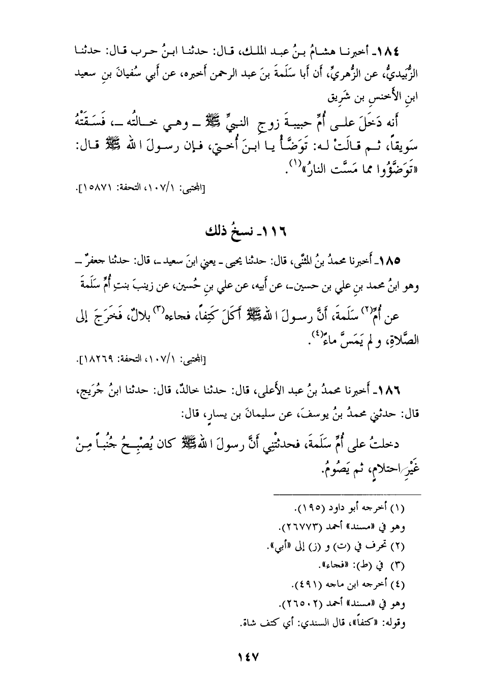 184 - أَخْبَرَنَا هِشَامُ بْنُ عَبْدِ الْمَلِكِ، قَالَ: حَدَّثَنَا ابْنُ حَرْبٍ، قَالَ: حَدَّثَنَا الزُّبَيْدِيُّ، عَنِ الزُّهْرِيِّ، أَنَّ أَبَا سَلَمَةَ بْنَ عَبْدِ الرَّحْمَنِ، أَخْبَرَهُ، عَنْ أَبِي سُفْيَانَ بْنِ سَعِيدِ بْنِ الْأَخْنَسِ بْنِ شَرِيقٍ، أَنَّهُ دَخَلَ عَلَى أُمِّ حَبِيبَةَ زَوْجِ النَّبِيِّ صَلَّى اللهُ عَلَيْهِ وَسَلَّمَ وَهِيَ خَالَتُهُ، فَسَقَتْهُ سَوِيقًا، ثُمَّ قَالَتْ لَهُ: تَوَضَّأْ يَا ابْنَ أُخْتِي، فَإِنَّ رَسُولَ اللهِ صَلَّى اللهُ عَلَيْهِ وَسَلَّمَ، قَالَ: «§تَوَضَّؤُوا مِمَّا مَسَّتِ النَّارُ»