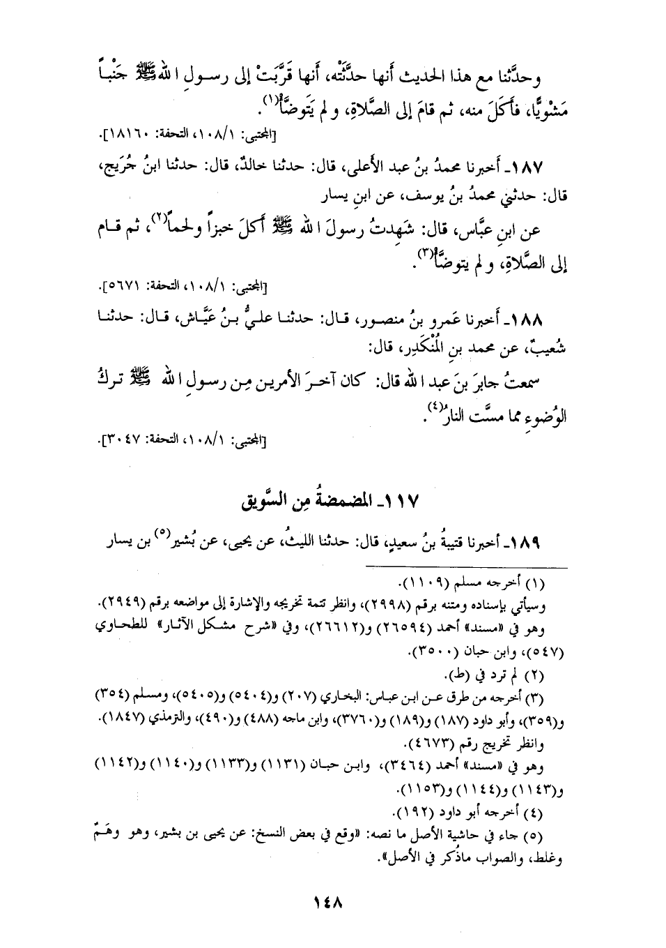 187 - أَخْبَرَنَا مُحَمَّدُ بْنُ عَبْدِ الْأَعْلَى، قَالَ: حَدَّثَنَا خَالِدٌ، قَالَ: حَدَّثَنَا ابْنُ جُرَيْجٍ، قَالَ: حَدَّثَنِي مُحَمَّدُ بْنُ يُوسُفَ، عَنِ ابْنِ يَسَارٍ، عَنِ ابْنِ عَبَّاسٍ قَالَ: شَهِدْتُ رَسُولَ اللهِ صَلَّى اللهُ عَلَيْهِ وَسَلَّمَ «§أَكَلَ خُبْزًا وَلَحْمًا، ثُمَّ قَامَ إِلَى الصَّلَاةِ، وَلَمْ يَتَوَضَّأْ»