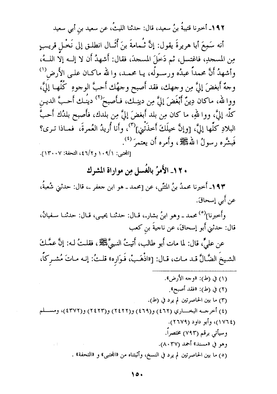 192 - أَخْبَرَنَا قُتَيْبَةُ بْنُ سَعِيدٍ، قَالَ: حَدَّثَنَا اللَّيْثُ، عَنْ سَعِيدِ بْنِ أَبِي سَعِيدٍ، أَنَّهُ سَمِعَ أَبَا هُرَيْرَةَ، يَقُولُ: إِنَّ ثُمَامَةَ بْنَ أُثَالٍ انْطَلَقَ إِلَى نَخْلٍ قَرِيبٍ مِنَ الْمَسْجِدِ فَاغْتَسَلَ، ثُمَّ دَخَلَ إِلَى الْمَسْجِدِ، فَقَالَ: أَشْهَدُ أَنْ لَا إِلَهَ إِلَّا اللهُ، وَأَشْهَدُ أَنَّ مُحَمَّدًا عَبْدُهُ وَرَسُولُهُ، يَا مُحَمَّدُ وَاللهِ مَا كَانَ عَلَى الْأَرْضِ وَجْهٌ أَبْغَضَ إِلَيَّ مِنْ وَجْهِكَ فَقَدْ أَصْبَحَ وَجْهُكَ أَحَبَّ الْوُجُوهِ كُلِّهَا، إِلَيَّ وَوَاللهِ مَا كَانَ دِينٌ أَبْغَضَ إِلَيَّ مِنْ دَيْنِكَ فَأَصْبَحَ دَيْنُكَ أَحَبَّ الدِّينِ كُلِّهِ إِلَيَّ، وَوَاللهِ مَا كَانَ مِنْ بَلَدٍ أَبْغَضَ إِلَيَّ مِنْ بَلَدِكَ فَأَصْبَحَ بَلَدُكَ أَحَبَّ الْبِلَادِ كُلِّهَا إِلَيَّ، وَإِنَّ خَيْلَكَ أَخَذَتْنِي وَأَنَا أُرِيدَ الْعُمْرَةَ فَمَاذَا تَرَى؟ «§فَبَشَّرَهُ رَسُولُ اللهِ صَلَّى اللهُ عَلَيْهِ وَسَلَّمَ وَأَمَرَهُ أَنْ يَعْتَمِرَ»