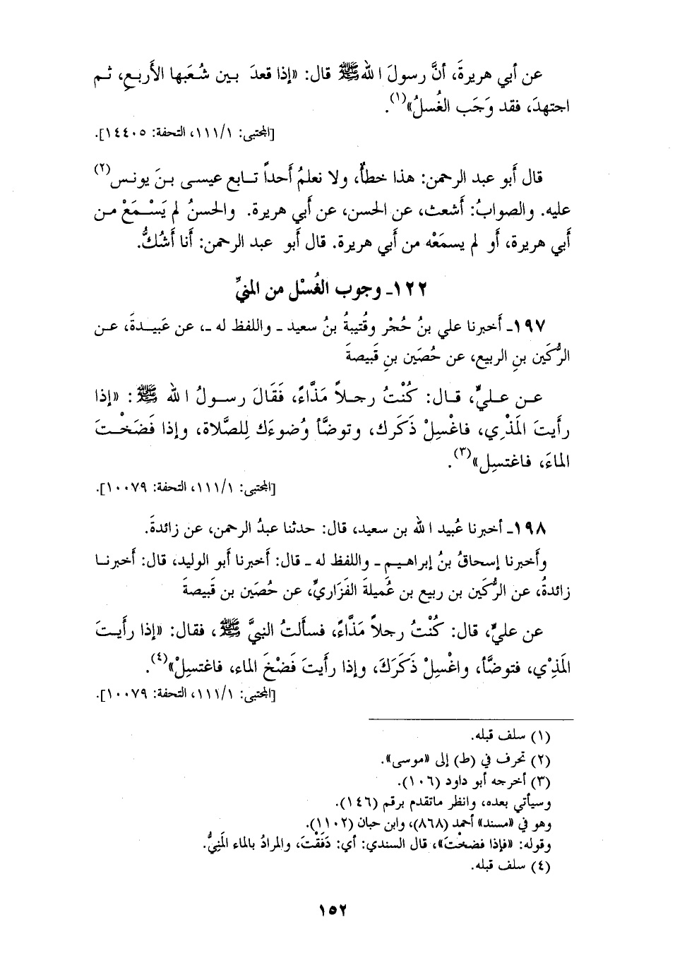 197 - أَخْبَرَنَا عَلِيُّ بْنُ حُجْرٍ وَقُتَيْبَةُ بْنُ سَعِيدٍ وَاللَّفْظُ لَهُ عَنْ عَبِيدَةَ، عَنِ الرُّكَيْنِ بْنِ الرَّبِيعِ، عَنْ حُصَيْنِ بْنِ قَبِيصَةَ، عَنْ عَلِيٍّ، قَالَ: كُنْتُ رَجُلًا مَذَّاءً فَقَالَ رَسُولُ اللهِ صَلَّى اللهُ عَلَيْهِ وَسَلَّمَ: «§إِذَا رَأَيْتَ الْمَذْيَ فَاغْسِلْ ذَكَرَكَ وَتَوَضَّأَ وُضُوءَكَ لِلصَّلَاةِ، وَإِذَا فَضَخْتَ الْمَاءَ فَاغْتَسِلْ»