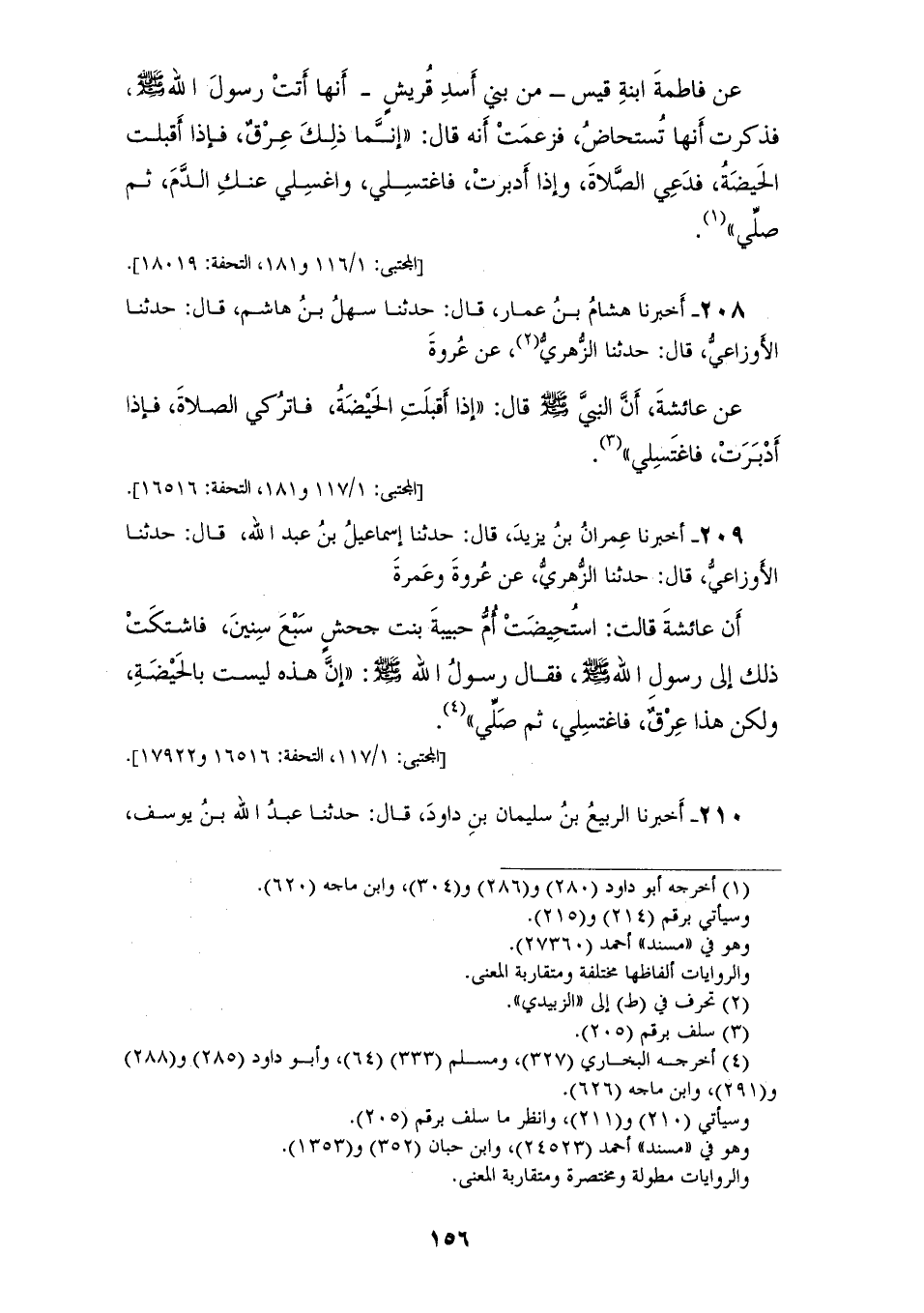 209 - أَخْبَرَنَا عِمْرَانُ بْنُ يَزِيدَ، قَالَ: حَدَّثَنَا إِسْمَاعِيلُ بْنُ عَبْدِ اللهِ، قَالَ: حَدَّثَنَا الْأَوْزَاعِيُّ، قَالَ: حَدَّثَنَا الزُّهْرِيُّ، عَنْ عُرْوَةَ، وَعُمْرَةَ، أَنَّ عَائِشَةَ، قَالَتِ: اسْتُحِيضَتْ أُمُّ حَبِيبَةَ بِنْتُ جَحْشٍ سَبْعَ سِنِينَ فَاشْتَكَتْ ذَلِكَ إِلَى رَسُولِ اللهِ صَلَّى اللهُ عَلَيْهِ وَسَلَّمَ، فَقَالَ رَسُولُ اللهِ صَلَّى اللهُ عَلَيْهِ وَسَلَّمَ: «§إِنَّ هَذِهِ لَيْسَتْ بِالْحَيْضَةِ، وَلَكِنْ هَذَا عِرْقٌ فَاغْتَسِلِي، ثُمَّ صَلِّي»