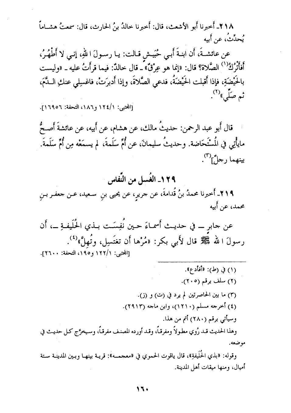 218 - أَخْبَرَنَا أَبُو الْأَشْعَثِ، قَالَ: أَخْبَرَنَا خَالِدُ بْنُ الْحَارِثِ، قَالَ: سَمِعْتُ هِشَامًا، يُحَدِّثُ عَنْ أَبِيهِ، عَنْ عَائِشَةَ، أَنَّ ابِنْة أَبِي حُبَيْشٍ، قَالَتْ: يَا رَسُولَ اللهِ إِنِّي لَا أَطْهُرُ، أَفَأَتْرُكُ الصَّلَاةَ؟ قَالَ: «§إِنَّمَا هُوَ عِرْقٌ» قَالَ: خَالِدٌ: فِيمَا قَرَأْتُ عَلَيْهِ، «وَلَيْسَتْ بِالْحَيْضَةِ، فَإِذَا أَقْبَلَتِ الْحَيْضَةُ فَدَعِي الصَّلَاةَ، وَإِذَا أَدْبَرَتْ فَاغْسِلِي عَنْكِ الدَّمَ، ثم صَلِّي» قَالَ: أَبُو عَبْدِ الرَّحْمَنِ: حَدِيثُ مَالِكٍ، عَنْ هِشَامٍ، عَنْ أَبِيهِ عَنْ عَائِشَةَ أَصَحُّ مَا يَأْتِي فِي الْمُسْتَحَاضَةِ، وَحَدِيثُ سُلَيْمَانَ، عَنْ أُمِّ سَلَمَةَ لَمْ يَسْمَعْهُ، مِنْ أُمِّ سَلَمَةَ بَيْنَهُمَا رَجُلٌ