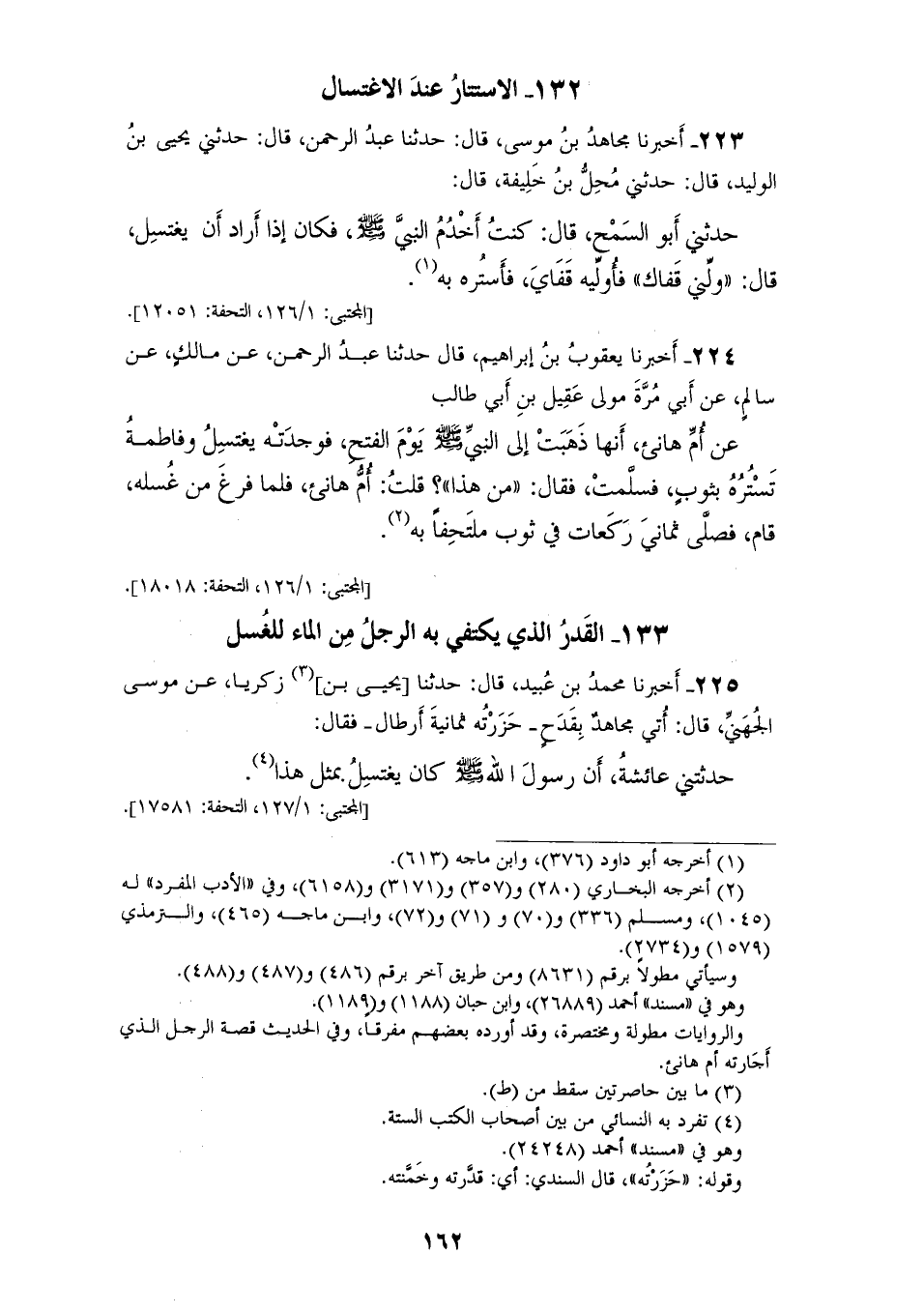 225 - أَخْبَرَنَا مُحَمَّدُ بْنُ عُبَيْدٍ، قَالَ: حَدَّثَنَا يَحْيَى بْنُ زَكَرِيَّا، عَنْ مُوسَى الْجُهَنِيِّ، قَالَ: أُتِيَ مُجَاهِدٌ، بِقَدَحٍ حَزَرْتُهُ ثَمَانِيَةَ أَرْطَالٍ، فَقَالَ: حَدَّثَتْنِي عَائِشَةُ: أَنَّ رَسُولَ اللهِ صَلَّى اللهُ عَلَيْهِ وَسَلَّمَ «§كَانَ يَغْتَسِلُ بِمِثْلِ هَذَا»
