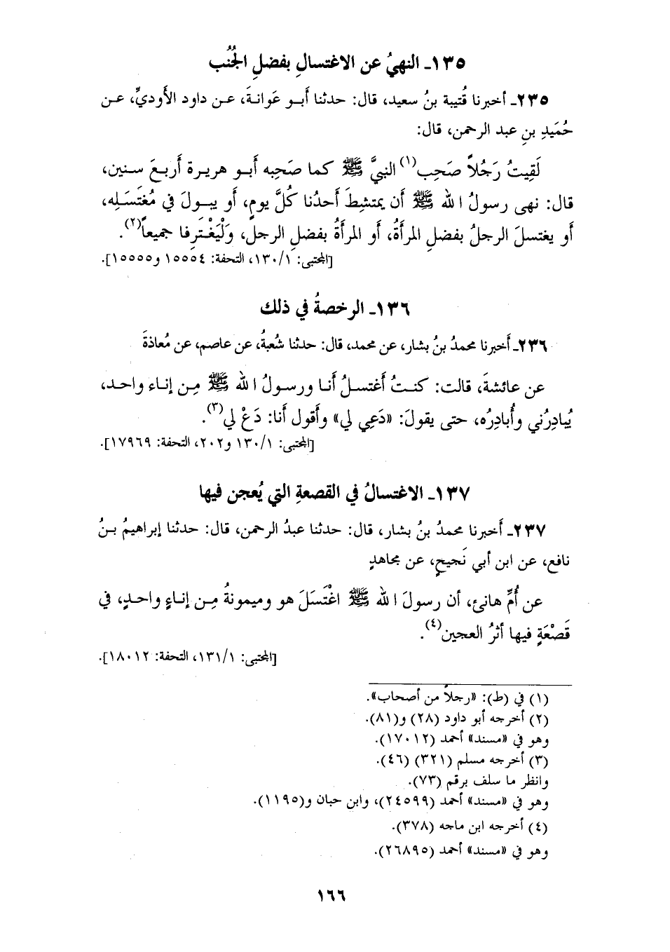 235 - أَخْبَرَنَا قُتَيْبَةُ بْنُ سَعِيدٍ، قَالَ: حَدَّثَنَا أَبُو عَوَانَةَ، عَنْ دَاوُدَ الْأَوْدِيِّ، عَنْ حُمَيْدِ بْنِ عَبْدِ الرَّحْمَنِ، قَالَ: لَقِيتُ رَجُلًا صَحِبَ النَّبِيَّ صَلَّى اللهُ عَلَيْهِ وَسَلَّمَ كَمَا صَحِبَهُ أَبُو هُرَيْرَةَ أَرْبَعَ سِنِينَ، قَالَ: «§نَهَى رَسُولُ اللهِ صَلَّى اللهُ عَلَيْهِ وَسَلَّمَ أَنْ يَمْتَشِطَ أَحَدُنَا كُلَّ يَوْمٍ، أَوْ يَبُولَ فِي مُغْتَسَلِهِ، أَوْ يَغْتَسِلَ الرَّجُلُ بِفَضْلِ الْمَرْأَةِ، أَوِ الْمَرْأَةُ بِفَضْلِ الرَّجُلِ وَلْيَغْتَرِفَا جَمِيعًا»