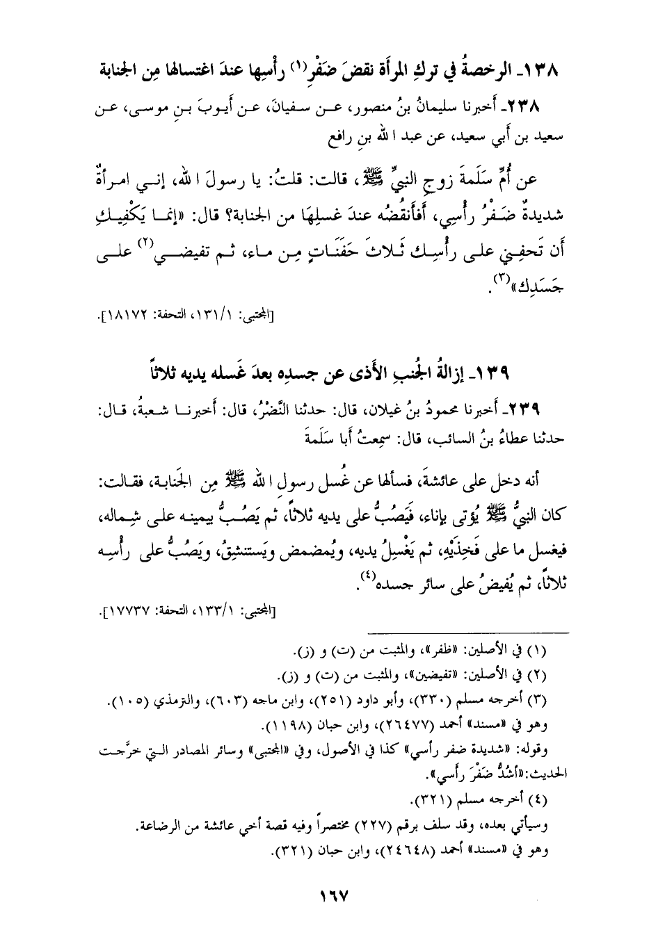238 - أَخْبَرَنَا سُلَيْمَانُ بْنُ مَنْصُورٍ، عَنْ سُفْيَانَ، عَنْ أَيُّوبِ بْنِ مُوسَى، عَنْ سَعِيدِ بْنِ أَبِي سَعِيدٍ، عَنْ عَبْدِ اللهِ بْنِ رَافِعٍ، عَنْ أُمِّ سَلَمَةَ، زَوْجِ النَّبِيِّ صَلَّى اللهُ عَلَيْهِ وَسَلَّمَ، قَالَتْ: قُلْتُ: يَا رَسُولَ اللهِ إِنِّي امْرَأَةٌ شَدِيدَةُ ضَفْرِ رَأْسِي أَفَأَنْقُضُهُ عِنْدَ غَسْلِهِا مِنَ الْجَنَابَةِ؟ قَالَ: «§إِنَّمَا يَكْفِيكِ أَنْ تَحْفِنِي عَلَى رَأْسِكِ ثَلَاثَ حَفَنَاتٍ مِنْ مَاءٍ، ثُمَّ تُفِيضِي عَلَى جَسَدِكِ»