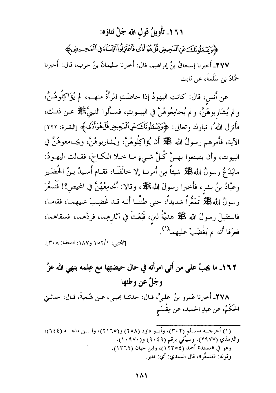 277 - أَخْبَرَنَا إِسْحَاقُ بْنُ إِبْرَاهِيمَ، قَالَ: أَخْبَرَنَا سُلَيْمَانُ بْنُ حَرْبٍ، قَالَ: أَخْبَرَنَا حَمَّادُ بْنُ سَلَمَةَ، عَنْ ثَابِتٍ، عَنْ أَنَسٍ، قَالَ: كَانَتِ الْيَهُودُ إِذَا حَاضَتِ الْمَرْأَةُ مِنْهُمْ لَمْ يُؤَاكِلُوهُنَّ، وَلَمْ يُشَارِبُوهُنَّ، وَلَمْ يُجَامِعُوهُنَّ فِي الْبُيُوتِ، فَسَأَلُوا النَّبِيَّ صَلَّى اللهُ عَلَيْهِ وَسَلَّمَ عَنْ ذَلِكَ، فَأَنْزَلَ اللهُ تَبَارَكَ وَتَعَالَى: {§وَيَسْئَلُونَكَ عَنِ الْمَحِيضِ قُلْ هُوَ أَذًى} الْآيَةُ، فَأَمَرَهُمْ رَسُولُ اللهِ صَلَّى اللهُ عَلَيْهِ وَسَلَّمَ أَنْ يُؤَاكِلُوهُنَّ وَيُشَارِبُوهُنَّ وَيُجَامِعُوهُنَّ فِي الْبُيُوتِ، وَأَنْ يَصْنَعُوا بِهِنَّ كُلَّ شَيْءٍ مَا خَلَا النِّكَاحِ، فَقَالَتِ الْيَهُودُ: مَا يَدَعُ رَسُولُ اللهِ صَلَّى اللهُ عَلَيْهِ وَسَلَّمَ شَيْئًا مِنْ أَمْرِنَا إِلَّا خَالَفَنَا، فَقَامَ أُسَيْدُ بْنُ الْحُضَيْرِ وَعَبَّادُ بْنُ بِشْرٍ فَأَخْبَرَا رَسُولَ اللهِ صَلَّى اللهُ عَلَيْهِ وَسَلَّمَ، وَقَالَا: أَنُجَامِعُهُنَّ فِي الْمَحِيضِ، فَتَمَعَّرَ رَسُولُ اللهِ صَلَّى اللهُ عَلَيْهِ وَسَلَّمَ تَمَعُّرًا شَدِيدًا حَتَّى ظَنَنَّا أَنَّهُ قَدْ غَضِبَ عَلَيْهِمَا، فَقَامَا، فَاسْتَقْبَلَ رَسُولُ اللهِ صَلَّى اللهُ عَلَيْهِ وَسَلَّمَ هَدِيَّةَ لَبَنٍ، فَبَعَثَ فِي آثَارِهِمَا فَرَدَّهُمَا فَسَقَاهُمَا، فَعَرَفَا أَنَّهُ لَمْ يَغْضَبْ عَلَيْهِمَا "