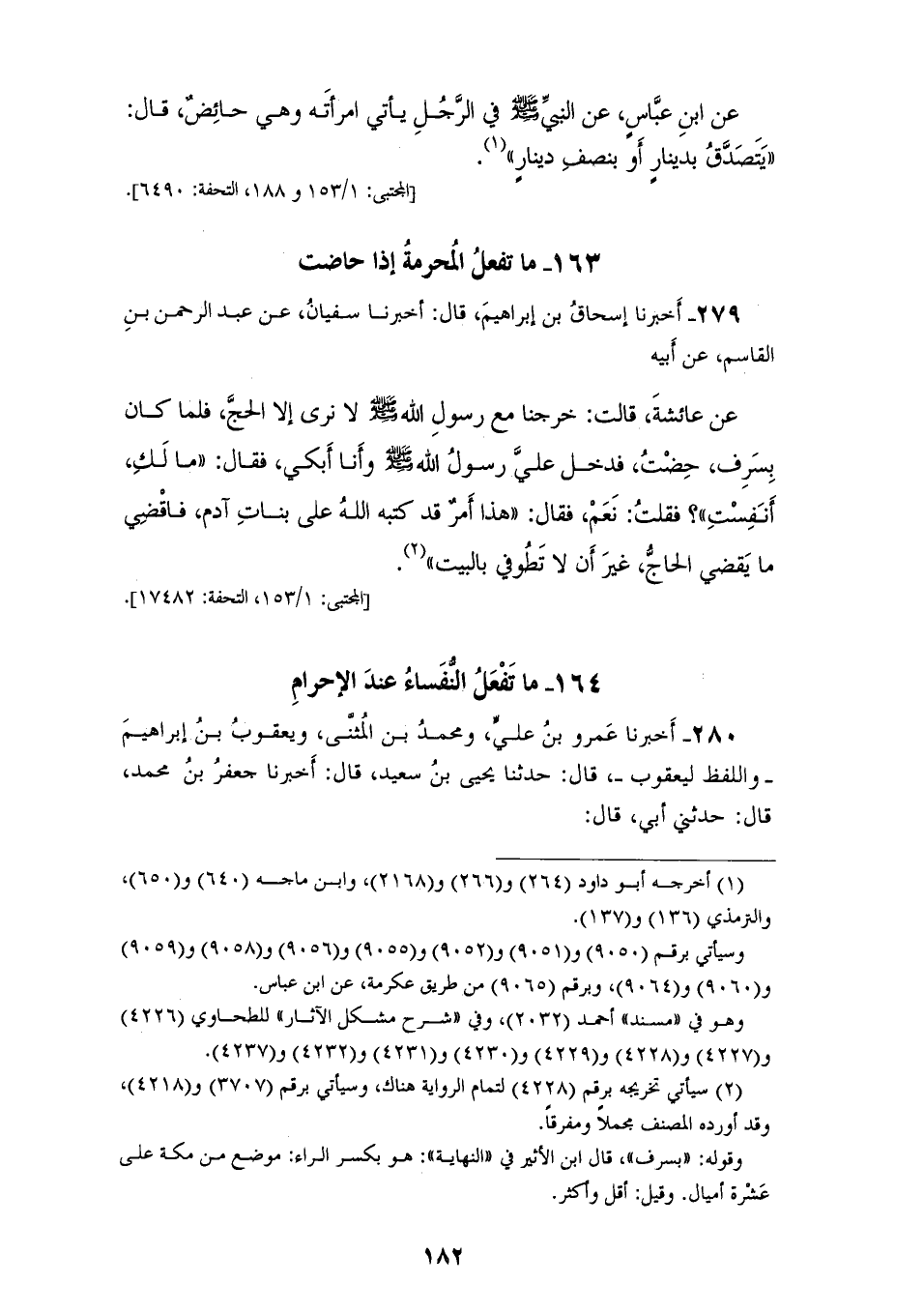 279 - أَخْبَرَنَا إِسْحَاقُ بْنُ إِبْرَاهِيمَ، قَالَ: أَخْبَرَنَا سُفْيَانُ، عَنْ عَبْدِ الرَّحْمَنِ بْنِ الْقَاسِمِ، عَنْ أَبِيهِ، عَنْ عَائِشَةَ، قَالَتْ: خَرَجْنَا مَعَ رَسُولِ اللهِ صَلَّى اللهُ عَلَيْهِ وَسَلَّمَ لَا نَرَى إِلَّا الْحَجَّ، فَلَمَّا كَانَ بِسَرَفٍ حِضْتُ فَدَخَلَ عَلَيَّ رَسُولُ اللهِ صَلَّى اللهُ عَلَيْهِ وَسَلَّمَ وَأَنَا أَبْكِي، فَقَالَ: «مَا لَكِ، أَنُفِسْتِ؟»، فَقُلْتُ: نَعَمْ، فَقَالَ: «§هَذَا أَمْرٌ قَدْ كَتَبَهُ اللهُ عَلَى بَنَاتِ آدَمَ، فَاقْضِي مَا يَقْضِي الْحَاجُّ غَيْرَ أَنْ لَا تَطُوفِي بِالْبَيْتِ»