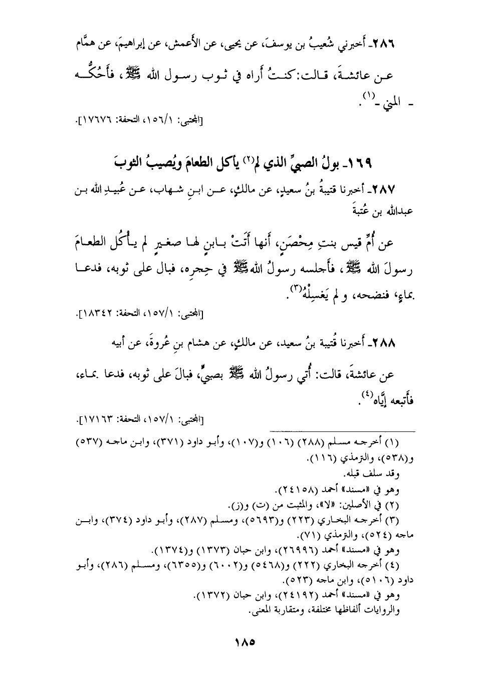 288 - أَخْبَرَنَا قُتَيْبَةُ بْنُ سَعِيدٍ، عَنْ مَالِكٍ، عَنْ هِشَامِ بْنِ عُرْوَةَ، عَنْ أَبِيهِ، عَنْ عَائِشَةَ، قَالَتْ: أُتِيَ رَسُولُ اللهِ صَلَّى اللهُ عَلَيْهِ وَسَلَّمَ بِصَبِيٍّ «§فَبَالَ عَلَى ثَوْبِهِ، فَدَعَا بِمَاءٍ فَأَتْبَعَهُ إِيَّاهُ»