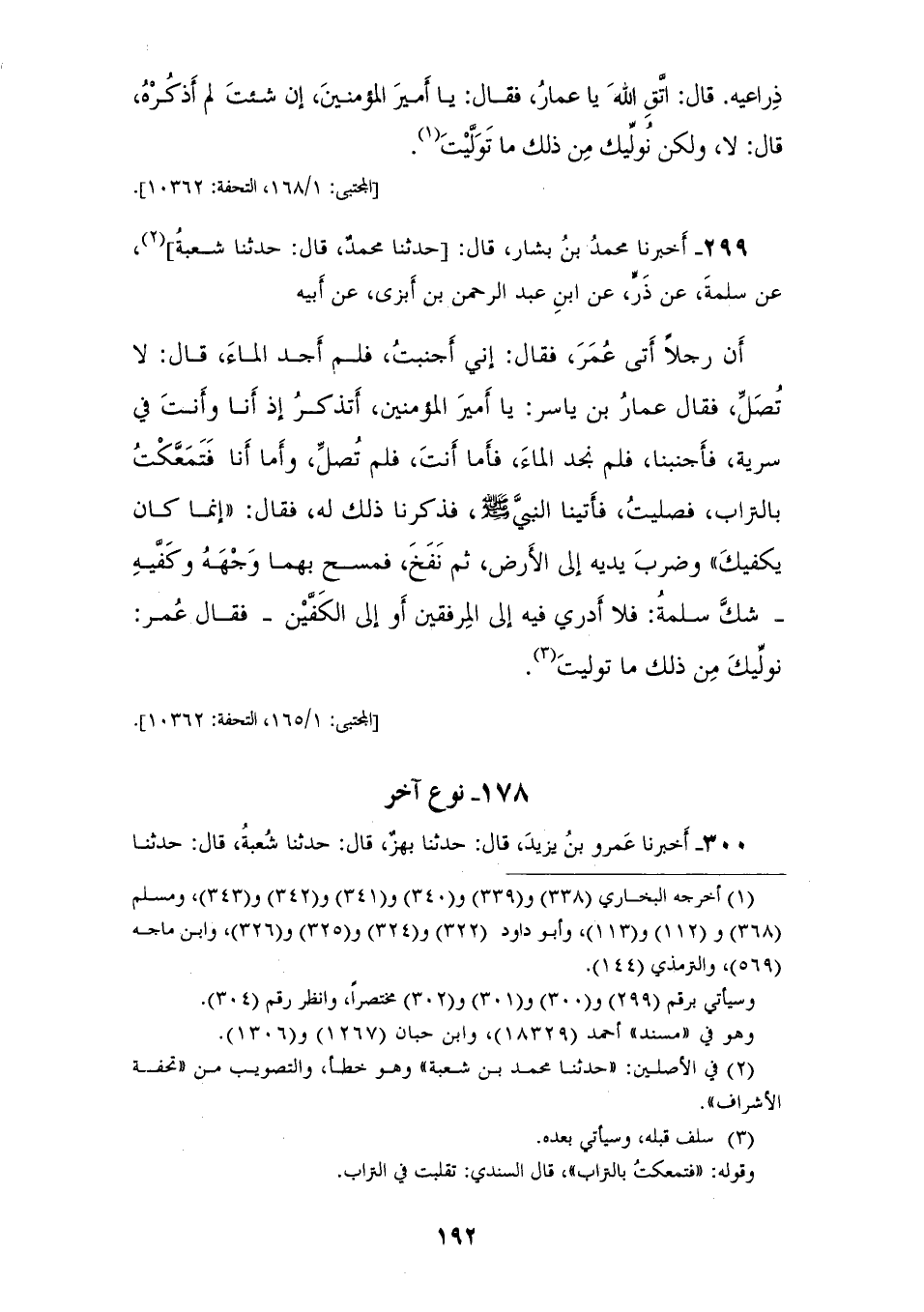 299 - أَخْبَرَنَا مُحَمَّدُ بْنُ بَشَّارٍ، قَالَ: حَدَّثَنَا مُحَمَّدٌ قَالَ: حَدَّثَنَا شُعْبَةُ، عَنْ، سَلَمَةَ، عَنْ ذرٍّ، عَنِ ابْنِ عَبْدِ الرَّحْمَنِ بْنِ أَبْزَى، عَنْ أَبِيهِ: أَنَّ رَجُلًا أتى عُمَرَ، فَقَالَ: إِنِّي أَجْنَبْتُ فَلَمْ أَجِدِ الْمَاءَ، قَالَ: لَا تُصَلِّ، فَقَالَ عَمَّارٌ بْنُ يَاسِرٍ: يَا أَمِيرَ الْمُؤْمِنِينَ، أَتَذْكُرُ إِذْ أَنَا وَأَنْتَ فِي سَرِيَّةٍ فَأَجْنَبْنَا فَلَمْ نَجِدْ المَاءً، فَأَمَّا أَنْتَ فَلَمْ تُصَلِّ، وَأَمَّا أَنَا فَتَمَعَّكْتُ بالتُّرَابِ، فصَلَّيْتُ فَأَتَيْنَا النبي صَلَّى اللهُ عَلَيْهِ وَسَلَّمَ فذَكَرْنَا ذَلِكَ لَهُ، فَقَالَ: «إِنَّمَا كَانَ يَكْفِيكَ»، §وَضَرَبَ يَدَيْهِ إِلَى الْأَرْضِ، ثُمَّ نَفَخَ فَمَسَحَ بِهِمَا وَجْهَهُ وَكَفَّيْهِ - شَكَّ سَلَمَةُ: فلَا أَدْرِي فِيهِ إِلَى الْمِرْفَقَيْنِ، أَوْ إِلَى الْكَفَّيْنِ - فقَالَ عُمَرُ: نُوَلِّيكَ مِنْ ذَلِكَ مَا تَوَلَّيْتَ