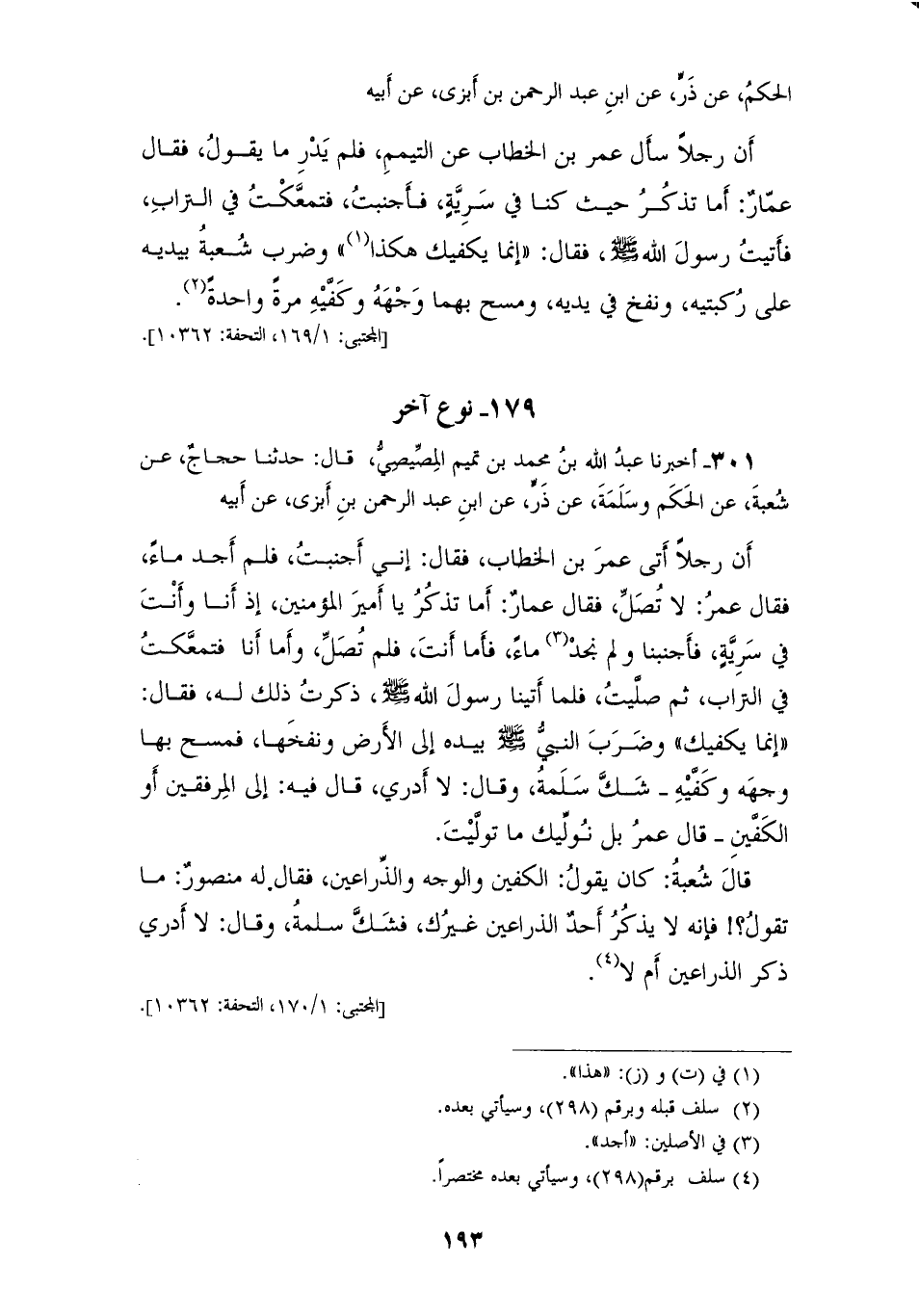 301 - أَخْبَرَنَا عَبْدُ اللهِ بْنُ مُحَمَّدِ بْنِ تَمِيمٍ الْمِصِّيصِيُّ، قَالَ: حَدَّثَنَا حَجَّاجٌ، عَنْ شُعْبَةَ، عَنِ الْحَكَمِ، وَسَلَمَةَ، عَنْ زِرٍّ، عَنِ ابْنِ عَبْدِ الرَّحْمَنِ بْنِ أَبْزَى، عَنْ أَبِيهِ، أَنَّ رَجُلًا أَتَى عُمَرَ بْنَ الْخَطَّابِ، فَقَالَ: إِنِّي أَجْنَبْتُ فَلَمْ أَجِدْ مَاءً، فَقَالَ عُمَرُ: لَا تُصَلِّ، فَقَالَ عَمَّارٌ " أَمَا تَذْكُرُ يَا أَمِيرَ الْمُؤْمِنِينَ، إِذْ أَنَا وَأَنْتَ فِي سَرِيَّةٍ فَأَجْنَبْنَا، وَلَمْ نَجِدْ مَاءً فَأَمَّا أَنْتَ فَلَمْ تُصَلِّ، وَأَمَّا أَنَا فَتَمَعَّكْتُ فِي التُّرَابِ ثُمَّ صَلَّيْتُ، فَلَمَّا أَتَيْنَا رَسُولَ اللهِ صَلَّى اللهُ عَلَيْهِ وَسَلَّمَ ذَكَرْتُ ذَلِكَ لَهُ، فَقَالَ: «إِنَّمَا يَكْفِيكَ» §وَضَرَبَ النَّبِيُّ صَلَّى اللهُ عَلَيْهِ وَسَلَّمَ بِيَدِهِ إِلَى الْأَرْضِ، وَنَفَخَهَا فَمَسَحَ بِهَا وَجْهَهُ وَكَفَّيْهِ " شَكَّ سَلَمَةُ وَقَالَ: لَا أَدْرِي قَالَ: فِيهِ إِلَى الْمِرْفَقَيْنِ أَوِ الْكَفَّيْنِ؟ قَالَ عُمَرُ: بَلْ نُوَلِّيكَ مَا تَوَلَّيْتَ، قَالَ شُعْبَةُ: كَانَ يَقُولُ: الْكَفَّيْنِ وَالْوَجْهَ وَالذِّرَاعَيْنِ، فَقَالَ: لَهُ مَنْصُورٌ مَا تَقُولُ؟ فَإِنَّهُ لَا يَذْكُرُ أَحَدٌ الذِّرَاعَيْنِ غَيْرُكَ، فَشَكَّ سَلَمَةُ، وَقَالَ: لَا أَدْرِي ذَكَرَ الذِّرَاعَيْنِ أَمْ لَا