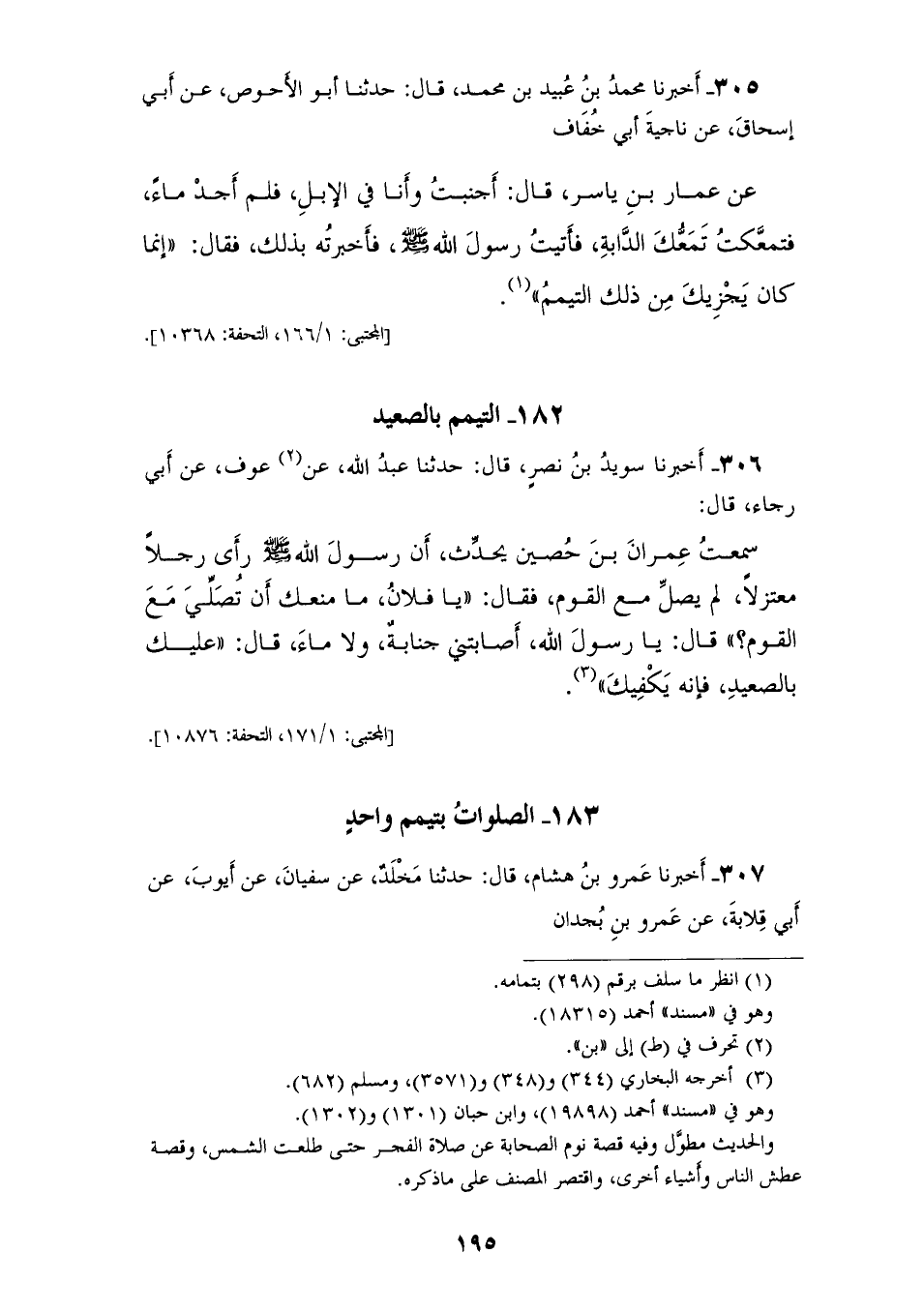 305 - أَخْبَرَنَا مُحَمَّدُ بْنُ عُبَيْدِ بْنِ مُحَمَّدٍ، قَالَ: حَدَّثَنَا أَبُو الْأَحْوَصِ، عَنْ أَبِي إِسْحَاقَ، عَنْ نَاجِيَةَ أَبِي خُفَافٍ، عَنْ عَمَّارِ بْنِ يَاسِرٍ، قَالَ: أَجْنَبْتُ، وَأَنَا فِي الْإِبِلِ، فَلَمْ أَجِدْ مَاءً فَتَمَعَّكْتُ تَمَعُّكَ الدَّابَّةِ فَأَتَيْتُ رَسُولَ اللهِ صَلَّى اللهُ عَلَيْهِ وَسَلَّمَ فَأَخْبَرْتُهُ بِذَلِكَ، فَقَالَ: «§إِنَّمَا كَانَ يُجْزِيكَ مِنْ ذَلِكَ التَّيَمُّمِ»
