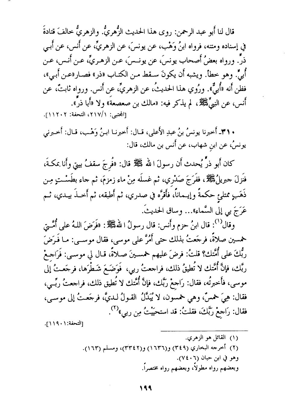 310 - أَخْبَرَنَا يُونُسُ بْنُ عَبْدِ الْأَعْلَى، قَالَ: أَخْبَرَنَا ابْنُ وَهْبٍ، قَالَ: أَخْبَرَنِي يُونُسُ، عَنِ ابْنِ شِهَابٍ، عَنْ أَنَسِ بْنِ مَالِكٍ، قَالَ: كَانَ أَبُو ذَرٍّ يُحَدِّثُ أَنَّ رَسُولَ اللهِ صَلَّى اللهُ عَلَيْهِ وَسَلَّمَ، قَالَ: «§فُرِجَ سَقْفُ بَيْتِي وَأنا بِمَكَّةَ فَنَزَلَ جِبْرِيلُ صَلَّى اللهُ عَلَيْهِ وَسَلَّمَ فَفَرَجَ صَدْرِي، ثُمَّ غَسَلَهُ مِنْ مَاءِ زَمْزَمَ، ثُمَّ جَاءَ بِطَسْتٍ مِنْ ذَهَبٍ مُمْتَلِئٍ حِكْمَةً وَإِيمَانًا فَأَقَرَّهُ فِي صَدْرِي، ثُمَّ أَطْبَقَهُ ثُمَّ أَخَذَ بِيَدِي، ثُمَّ عَرَجَ بِي إِلَى السَّمَاءِ» وَسَاقَ الْحَدِيثَ وَقَالَ: قَالَ ابْنُ حَزْمٍ وَأَنَسٌ: قَالَ رَسُولُ اللهِ صَلَّى اللهُ عَلَيْهِ وَسَلَّمَ: فَرْضَ اللهُ عَلَى أُمَّتِي خَمْسِينَ صَلَاةً، فَرَجَعْتُ بِذَلِكَ حَتَّى أَمُرَّ عَلَى مُوسَى، فَقَالَ مُوسَى: مَا فَرْضَ رَبُّكَ عَلَى أُمَّتِكَ؟ فَقُلْتُ: فَرْضَ عَلَيْهِمْ خَمْسِينَ صَلَاةً، قَالَ لِي مُوسَى: فَرَاجِعْ رَبَّكَ فَإِنَّ أُمَّتَكَ لَا تُطِيقُ ذَلِكَ، فَرَاجَعْتُ رَبِّي فَوَضَعَ شَطْرَهَا، فَرَجَعْتُ إِلَى مُوسَى فَأَخْبَرْتُهُ، فَقَالَ: رَاجِعْ رَبَّكَ فَإِنَّ أُمَّتَكَ لَا تُطِيقُ ذَلِكَ، فَرَاجَعْتُ رَبِّي، فَقَالَ: هِيَ خَمْسٌ وَهِيَ خَمْسُونَ لَا يُبَدَّلُ الْقَوْلُ لَدَيَّ، فَرَجَعْتُ إِلَى مُوسَى، فَقَالَ: رَاجِعْ رَبَّكَ، فَقُلْتُ: قَدِ اسْتَحْيَيْتُ مِنْ رَبِّي "