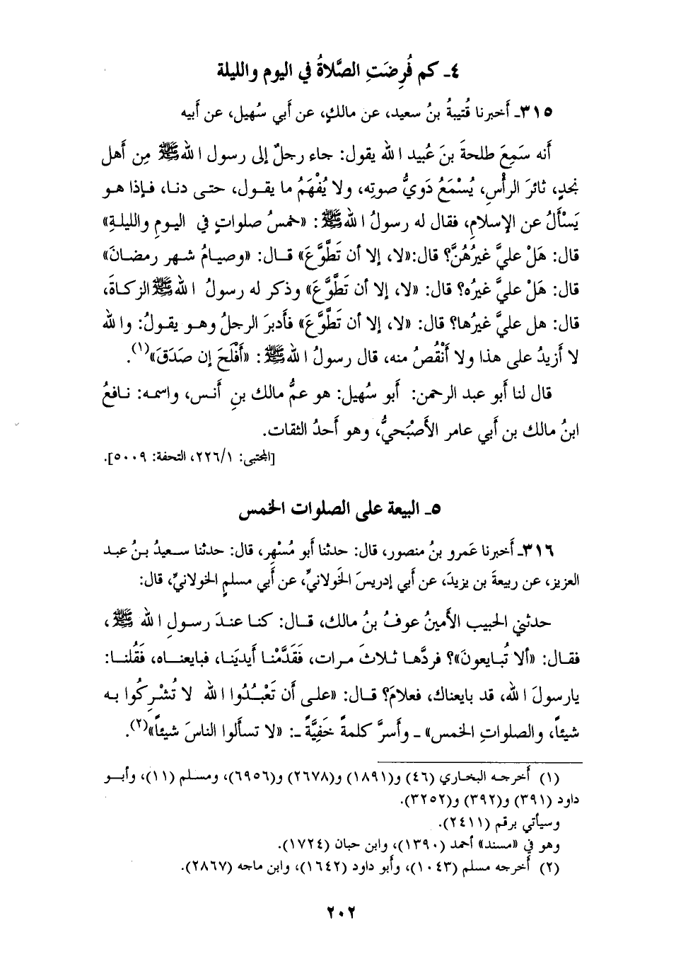 315 - أَخْبَرَنَا قُتَيْبَةُ بْنُ سَعِيدٍ، عَنْ مَالِكٍ، عَنْ أَبِي سُهَيْلٍ، عَنْ أَبِيهِ، أَنَّهُ سَمِعَ طَلْحَةَ بْنَ عُبَيْدِ اللهِ، يَقُولُ: جَاءَ رَجُلٌ إِلَى رَسُولِ اللهِ صَلَّى اللهُ عَلَيْهِ وَسَلَّمَ، مِنْ أَهْلِ نَجْدٍ ثَائِرَ الرَّأْسِ يُسْمَعُ دَوِيُّ صَوْتِهِ، وَلَا يُفْهَمُ مَا يَقُولُ، حَتَّى دَنَا فَإِذَا هُوَ يَسْأَلُ عَنِ الْإِسْلَامِ؟ فَقَالَ لَهُ رَسُولُ اللهِ صَلَّى اللهُ عَلَيْهِ وَسَلَّمَ: «§خَمْسُ صَلَوَاتٍ فِي الْيَوْمِ وَاللَّيْلَةِ»، قَالَ: هَلْ عَلَيَّ غَيْرُهُنَّ؟، قَالَ: «لَا إِلَّا أَنْ تَطَوَّعَ»، قَالَ: وَصِيَامُ شَهْرِ رَمَضَانَ، قَالَ: هَلْ عَلَيَّ غَيْرُهُ؟، قَالَ: «لَا إِلَّا أَنْ تَطَوَّعَ» وَذَكَرَ لَهُ رَسُولُ اللهِ صَلَّى اللهُ عَلَيْهِ وَسَلَّمَ الزَّكَاةَ، قَالَ: هَلْ عَلَيَّ غَيْرُهَا؟، قَالَ: «لَا إِلَّا أَنْ تَطَوَّعَ»، فَأَدْبَرَ الرَّجُلُ وَهُوَ يَقُولُ: وَاللهِ لَا أَزِيدُ عَلَى هَذَا وَلَا أَنْقُصُ مِنْهُ، قَالَ رَسُولُ اللهِ صَلَّى اللهُ عَلَيْهِ وَسَلَّمَ: «أَفْلَحَ إِنْ صَدَقَ» قَالَ لَنَا: أَبُو عَبْدِ الرَّحْمَنِ: أَبُو سُهَيْلٍ هُوَ عَمُّ مَالِكِ بْنِ أَنَسٍ وَاسْمُهُ نَافِعُ بْنُ مَالِكِ بْنِ أَبِي عَامِرٍ الْأَصْبَحِيُّ وَهُوَ أَحَدُ الثِّقَاتِ