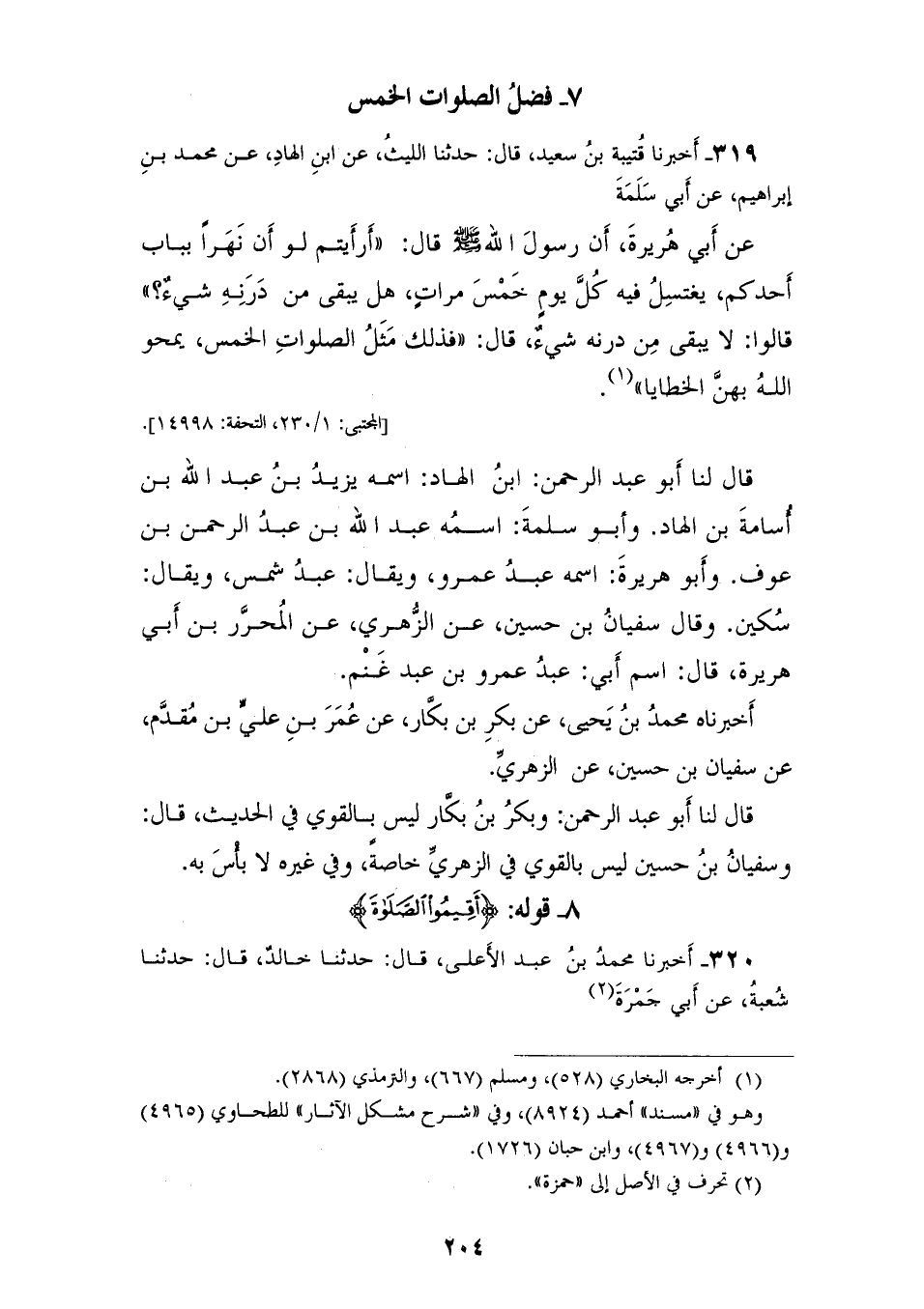 319 - أَخْبَرَنَا قُتَيْبَةُ بْنُ سَعِيدٍ، قَالَ: حَدَّثَنَا اللَّيْثُ، عَنِ ابْنِ الْهَادِ، عَنْ مُحَمَّدِ بْنِ إِبْرَاهِيمَ، عَنْ أَبِي سَلَمَةَ، عَنْ أَبِي هُرَيْرَةَ، أَنَّ رَسُولَ اللهِ صَلَّى اللهُ عَلَيْهِ وَسَلَّمَ، قَالَ: «§أَرَأَيْتُمْ لَوْ أَنَّ نَهْرًا بِبَابِ أَحَدِكُمْ يَغْتَسِلُ فِيهِ كُلَّ يَوْمٍ خَمْسَ مَرَّاتٍ، هَلْ يَبْقَى مِنْ دَرَنِهِ شَيْءٌ؟»، قَالُوا: لَا يَبْقَى مِنْ دَرَنِهِ شَيْءٌ، قَالَ: «فَذَلِكَ مِثْلُ الصَّلَوَاتِ الْخَمْسِ، يَمْحُو اللهُ بِهِنَّ الْخَطَايَا». قَالَ لَنَا أَبُو عَبْدِ الرَّحْمَنِ: ابْنُ الْهَادِ اسْمُهُ يَزِيدُ بْنُ عَبْدِ اللهِ بْنِ أُسَامَةَ بْنِ الْهَادِ، وَأَبُو سَلَمَةَ اسْمُهُ عَبْدُ اللهِ بْنُ عَبْدِ الرَّحْمَنِ بْنِ عَوْفٍ، وَأَبُو هُرَيْرَةَ اسْمُهُ عَبْدُ عَمْرٍو، وَيُقَالُ عَبْدُ شَمْسٍ، وَيُقَالُ سُكَيْنٍ، وَقَالَ: سُفْيَانُ بْنُ حُسَيْنٍ، عَنِ الزُّهْرِيِّ، عَنِ الْمُحَرَّرِ بْنِ أَبِي هُرَيْرَةَ، قَالَ: اسْمُ أَبِي عَبْدُ عَمْرِو بْنُ عَبْدِ غَنْمٍ، أَخْبَرَنَاهُ مُحَمَّدُ بْنُ يَحْيَى، عَنْ بَكْرِ بْنِ بَكَّارٍ، عَنْ عُمَرَ بْنِ عَلِيِّ بْنِ مَقْدَمٍ، عَنْ سُفْيَانَ بْنِ حُسَيْنٍ، عَنِ الزُّهْرِيِّ، قَالَ لَنَا: أَبُو عَبْدِ الرَّحْمَنِ: وَبَكْرُ بْنُ بَكَّارٍ لَيْسَ بِالْقَوِيِّ فِي الْحَدِيثِ، قَالَ: وَسُفْيَانُ بْنُ حُسَيْنٍ لَيْسَ بِالْقَوِيِّ فِي الزُّهْرِيِّ خَاصَّةً وَفِي غَيْرِهِ لَا بَأْسَ بِهِ