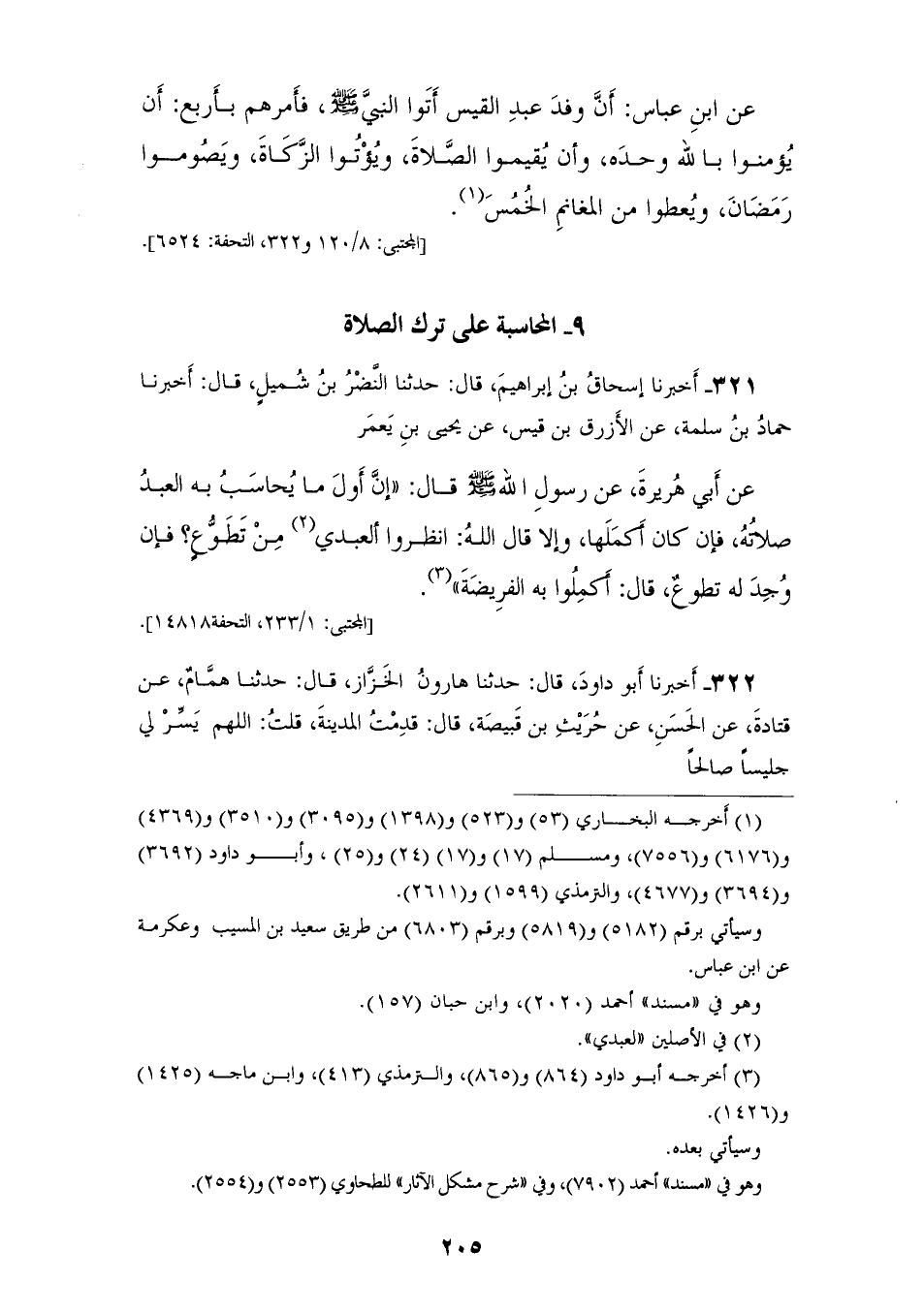 321 - أَخْبَرَنَا إِسْحَاقُ بْنُ إِبْرَاهِيمَ، قَالَ: حَدَّثَنَا النَّضْرُ بْنُ شُمَيْلٍ، قَالَ: أَخْبَرَنَا حَمَّادُ بْنُ سَلَمَةَ، عَنِ الْأَزْرَقِ بْنِ قَيْسٍ، عَنْ يَحْيَى بْنِ يَعْمُرَ، عَنْ أَبِي هُرَيْرَةَ، عَنْ رَسُولِ اللهِ صَلَّى اللهُ عَلَيْهِ وَسَلَّمَ، قَالَ: إِنَّ " §أَوَّلَ مَا يُحَاسَبُ بِهِ الْعَبْدُ صَلَاتُهُ، فَإِنْ كَانَ أَكْمَلَهَا وَإِلَّا قَالَ اللهُ: انْظُرُوا أَلِعَبْدِي مِنْ تَطَوُّعٍ، فَإِنْ وُجِدَ لَهُ تَطَوُّعٌ، قَالَ: أَكْمِلُوا بِهِ الْفَرِيضَةَ "