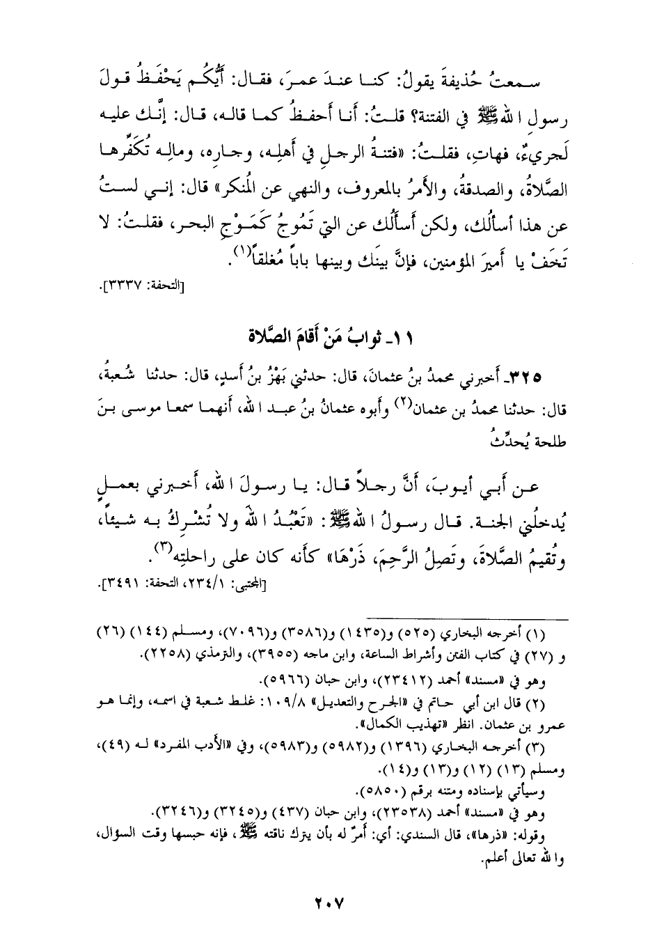 325 - أَخْبَرَنِي مُحَمَّدُ بْنُ عُثْمَانَ، قَالَ: حَدَّثَنِي بَهْزُ بْنُ أَسَدٍ، قَالَ: حَدَّثَنَا شُعْبَةُ، قَالَ: حَدَّثَنَا مُحَمَّدُ بْنُ عُثْمَانَ، وَأَبُوهُ عُثْمَانُ بْنُ عَبْدِ اللهِ، أَنَّهُمَا سَمِعَا مُوسَى بْنَ طَلْحَةَ، يُحَدِّثُ، عَنْ أَبِي أَيُّوبَ، أَنَّ رَجُلًا، قَالَ: يَا رَسُولَ اللهِ، أَخْبِرْنِي بِعَمَلٍ يُدْخِلُنِي الْجَنَّةَ، قَالَ رَسُولُ اللهِ صَلَّى اللهُ عَلَيْهِ وَسَلَّمَ: «§تَعْبُدَ اللهَ وَلَا تُشْرِكَ بِهِ شَيْئًا وَتُقِيمَ الصَّلَاةَ وَتَصِلَ الرَّحِمَ ذَرْهَا كَأَنَّهُ كَانَ عَلَى رَاحِلَتِهِ»
