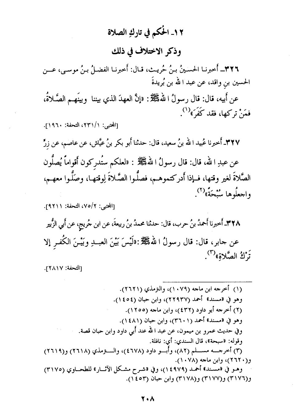 328 - أَخْبَرَنَا أَحْمَدُ بْنُ حَرْبٍ، قَالَ: حَدَّثَنَا مُحَمَّدُ بْنُ رَبِيعَةَ، عَنِ ابْنِ جُرَيْجٍ، عَنْ أَبِي الزُّبَيْرِ، عَنْ جَابِرٍ، قَالَ: قَالَ رَسُولُ اللهِ صَلَّى اللهُ عَلَيْهِ وَسَلَّمَ: «§لَيْسَ بَيْنَ الْعَبْدِ وَبَيْنَ الْكُفْرِ إِلَّا تَرْكُ الصَّلَاةِ»